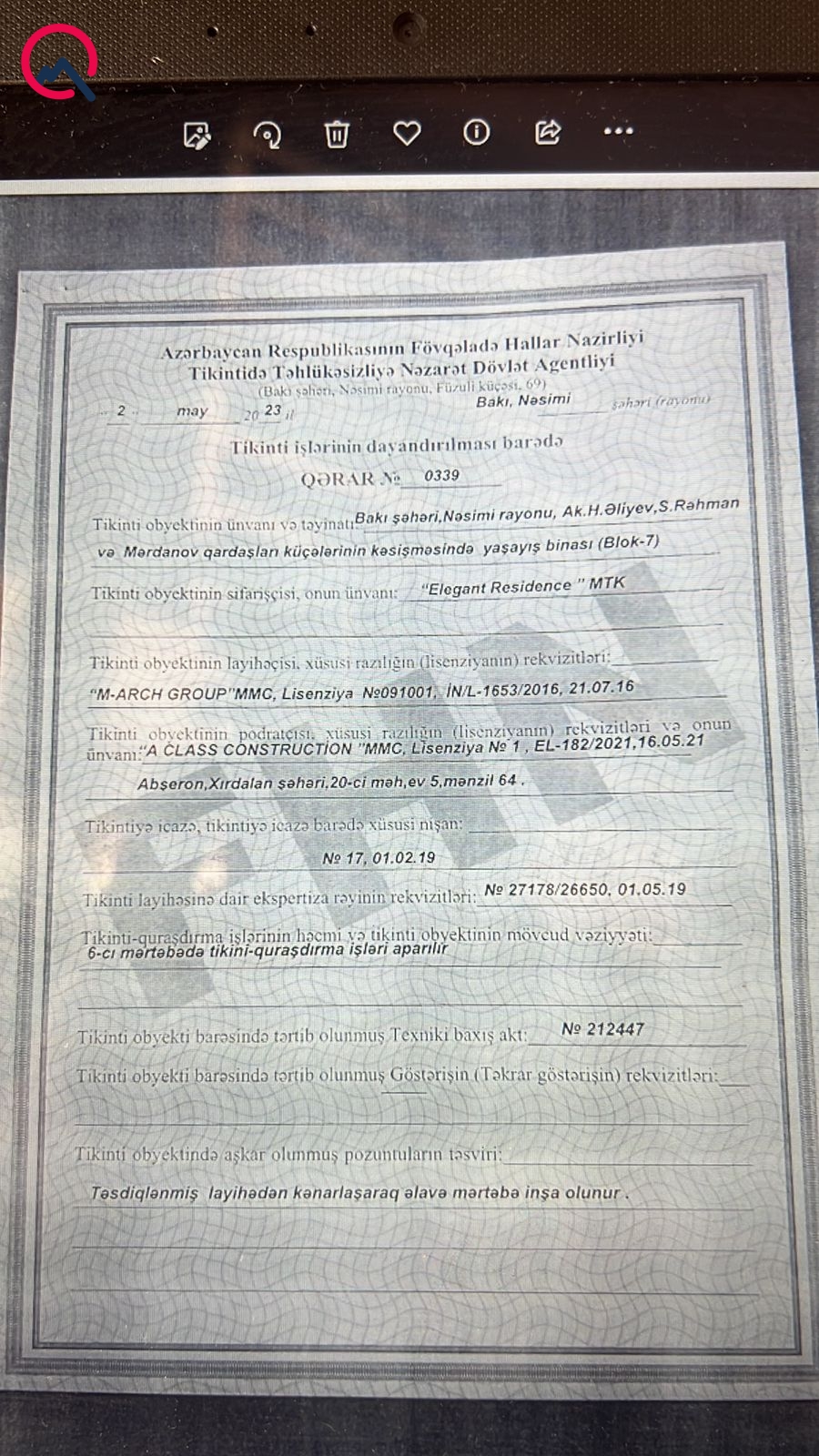 Ev Bakı şəhər İcra Hakimiyyətinin 1998-ci il tarixli Sərəncamı ilə tikilib və qəzalı vəziyyətdə deyil: “1962-ci ildən bu məhəllədə yaşayırıq. Bu gördüyünüz ev isə 1998-ci ildə tikilib. Tam olaraq müasir tələblərə də uyğundur. “Elegant Residence MTK” ilə ilk razılığımız o cür olub ki, bizim bu ərazidə hazırda nə mülkümüz varsa, 20 faiz artığına özəl torpaq olmaq şərti ilə alıb verin, yaxud torpaq alaraq tikib evi verin, biz də buradan çıxaq. Şirkətdən də bildirdilər ki, bizə güzəşt edin, o qədər pulumuz yoxdur, burada torpaq sahəsi də yoxdur. Biz də razılaşdıq. Onlar bildirdi ki, burada bina tikiləndən sonra 630 kvadrat metr sahədə bizə mənzil veriləcək. Mən də dedim ki, evdə 90 yaşlı anam, 3 balaca nəvəm var. Biz bu yaşdan sonra kirayələrdə yaşaya bilmərik. Təklif etdikləri binann da layihəsi çox yöndəmsiz idi. Mən onlara bildirdim ki, yeni mənzil üçün nə qədər sahəlik ev verəcəksinizsə, onun əvəzinə nə kirayə pulu, nə də təmir pulunu istəyirəm. Mənə elə hazır ev alıb verin. Təklif etdiyimiz ev də təmir olunmalı idi. Mən o pulu da istəmədim, razılaşdılar. Amma almaq üçün vaxtı uzatdılar və daha sonra dedilər ki, sahibi satmaq istəmir”.