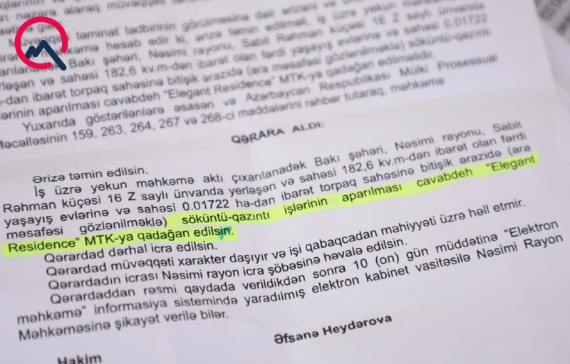 Rəfayıl Məmmədovun oğlu Fərhad Məmmədov deyir ki, Nəsimi Rayon Məhkəməsinin 27 iyul 2023-cü il tarixli, yaşadıqları evə bitişik hissədə qazıntı işlərinin aparılmaması ilə əlaqədar məhkəmə qərarı var: “Mülkiyyətimizdə olan torpaq sahəsi Nəsimi RİH tərəfindən AR Konsitutsiyasının 13-cü maddəsinə, Prezident İlham Əliyevin Şəhərsalma və Tikinti Məcəlləsinin təsdiq edilməsi haqqında Fərmanı, AR Torpaq Haqqında məcəlləyə, AR Mülkü Məcəlləsinə Şəhərsalma və Tikinti Məcəlləsinin 75.3.1 maddəsinə zidd olaraq Elegance Residence MTK-ya tikinti üçün verilib. Nəticədə vətəndaşın əsas hüquqlarından biri olan mülkiyyət hüquqları pozulub”.