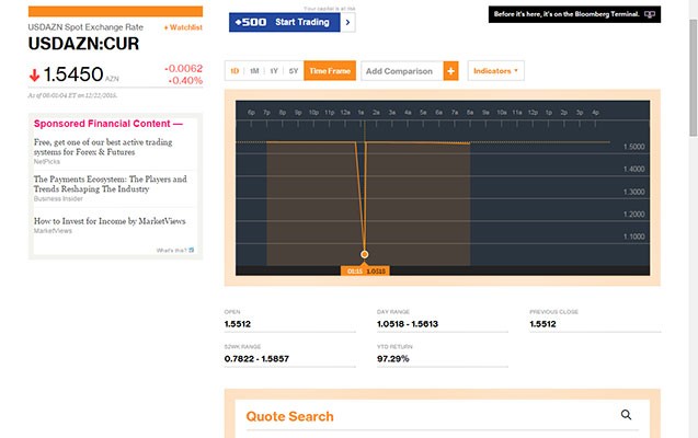 “Bloomberg”in məzənnələr sistemində Dollar/Manat məzənnəsi tez-tez yenilənir. Bakı vaxtı ilə 15:20-yə olan məlumata görə, 1 dollar 1,55 manata bərabərdir.