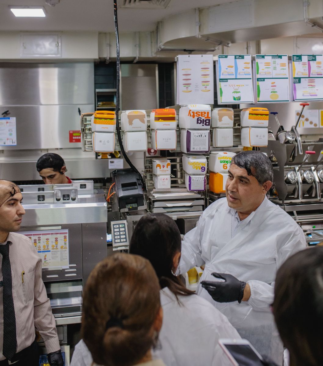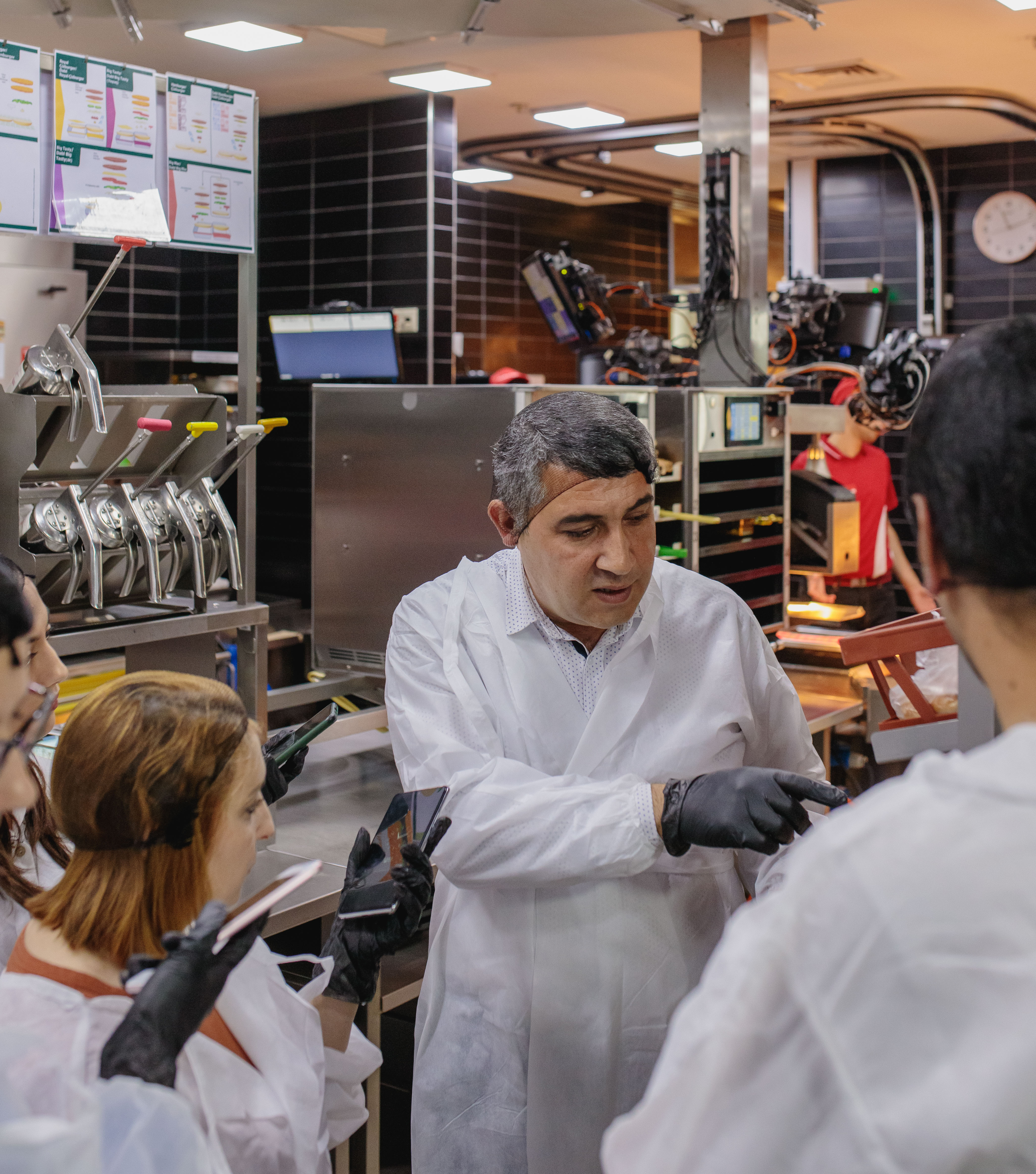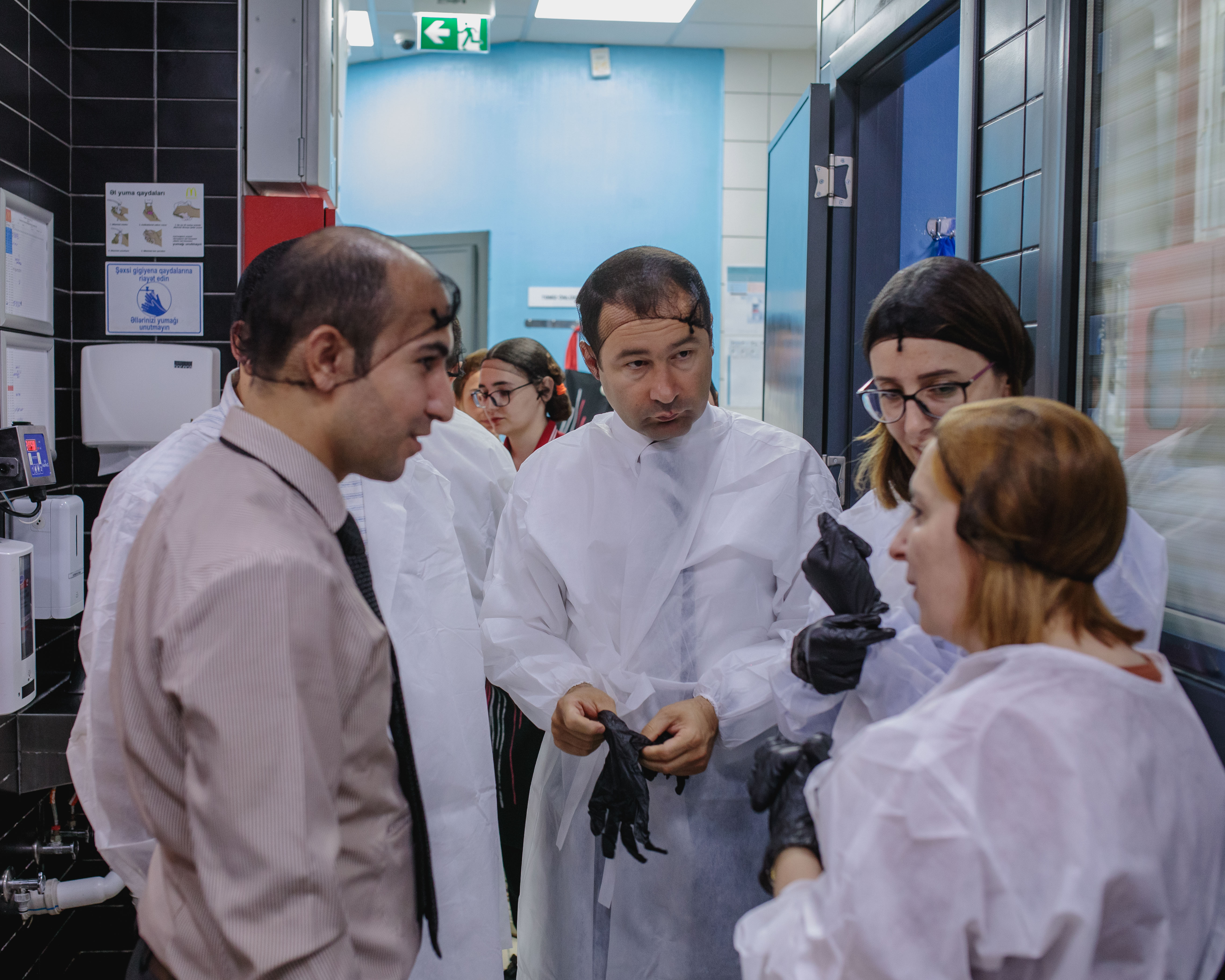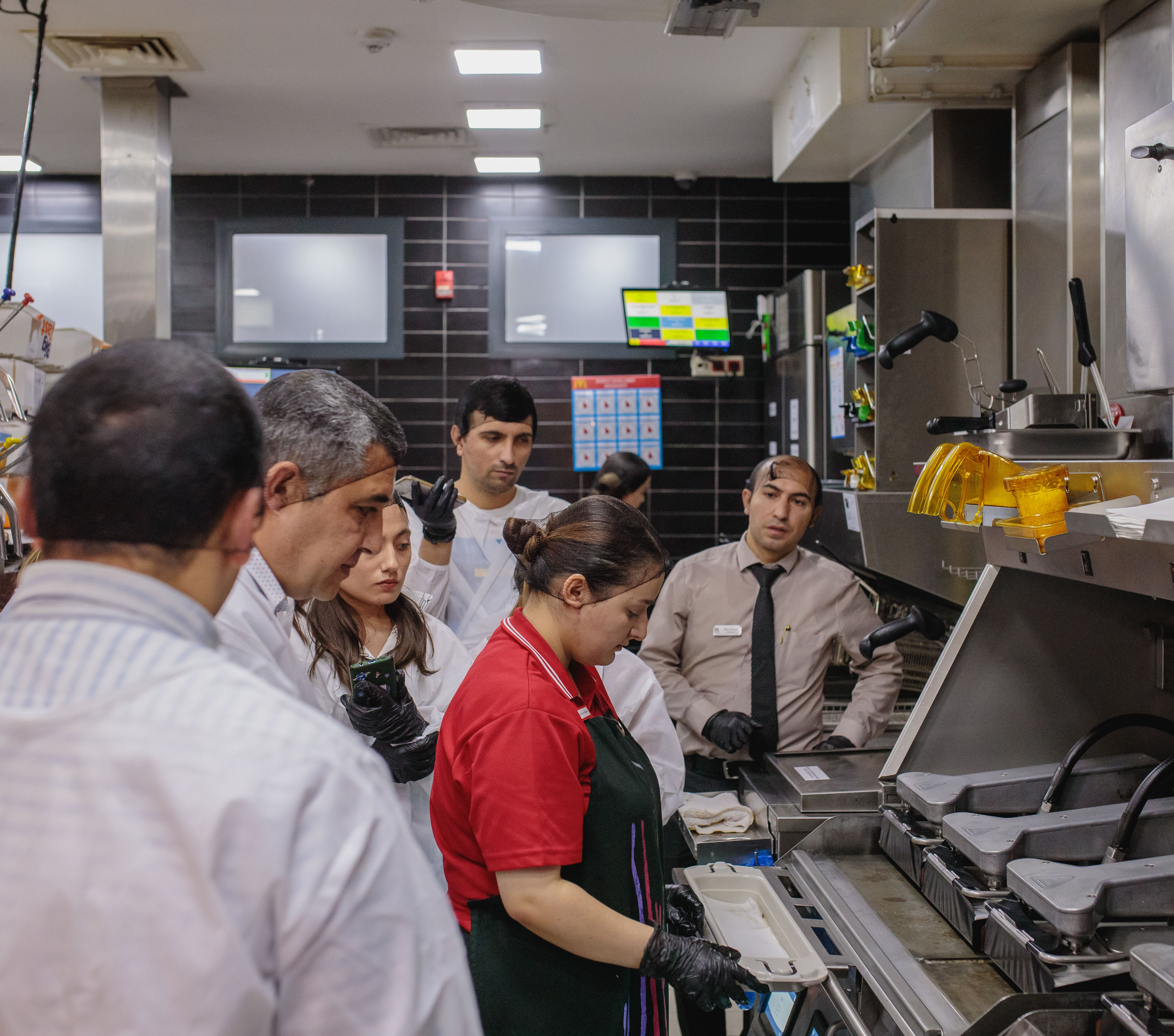“McDonald's”ın “Grand Hayat” filialı bir ildən çoxdur fəaliyyətə başlasa da, digər restoranlara xas qələbəliyi burada hiss etmək mümkün deyil. Restoran rəhbərliyi bizi əvvəlcə təlimatla tanış edir, yoluxucu xəstəliyimizin olmadığı ilə bağlı kağıza imza atdıqdan sonra təhlükəsizlik qaydalarına əməl etməklə xüsusi geyim, əlcək və baş örtüyü geyinib daxili əraziyə giririk.