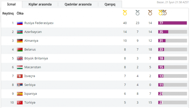 Azərbaycan yerini yenə də dəyişməyib. Ölkəmiz ikinci yeri əldən verməyib (14 qızıl, 7 gümüş, 14 bürünc).