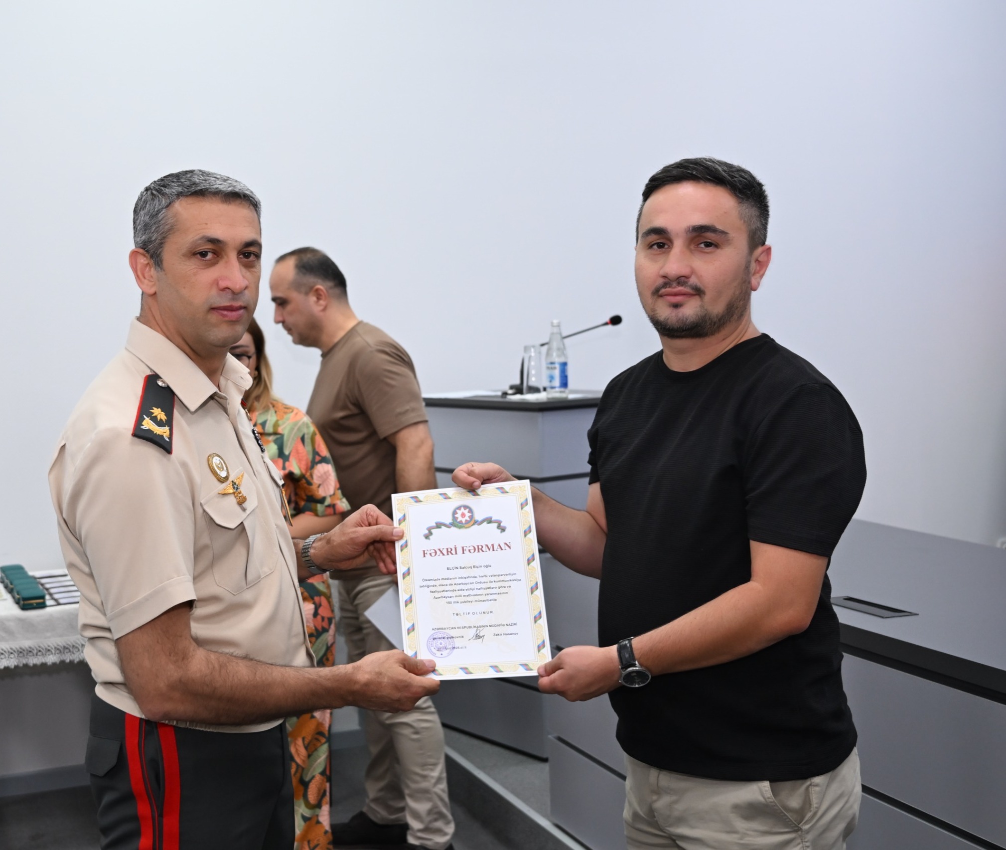 Qeyd edək ki, ordu quruculuğu sahəsində aparılan uğurlu islahatların ictimaiyyətə çatdırılmasında, hərbi-vətənpərvərliyin təbliğində və dezinformasiyalara qarşı mübarizədə Müdafiə Nazirliyi ilə birgə əməkdaşlıqda fərqlənən bir qrup media nümayəndələri də tədbirdə təltif ediliblər.