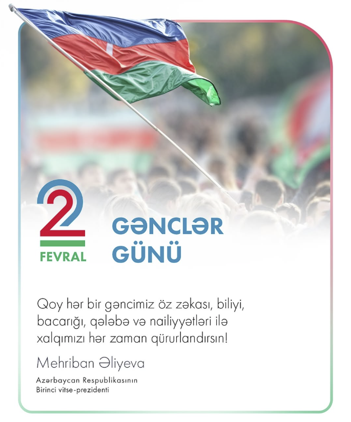 Azərbaycan Birinci vitse-prezidenti Mehriban Əliyeva 2 Fevral – Azərbaycan Gəncləri Günü münasibətilə rəsmi sosial şəbəkə hesabında paylaşım edib.