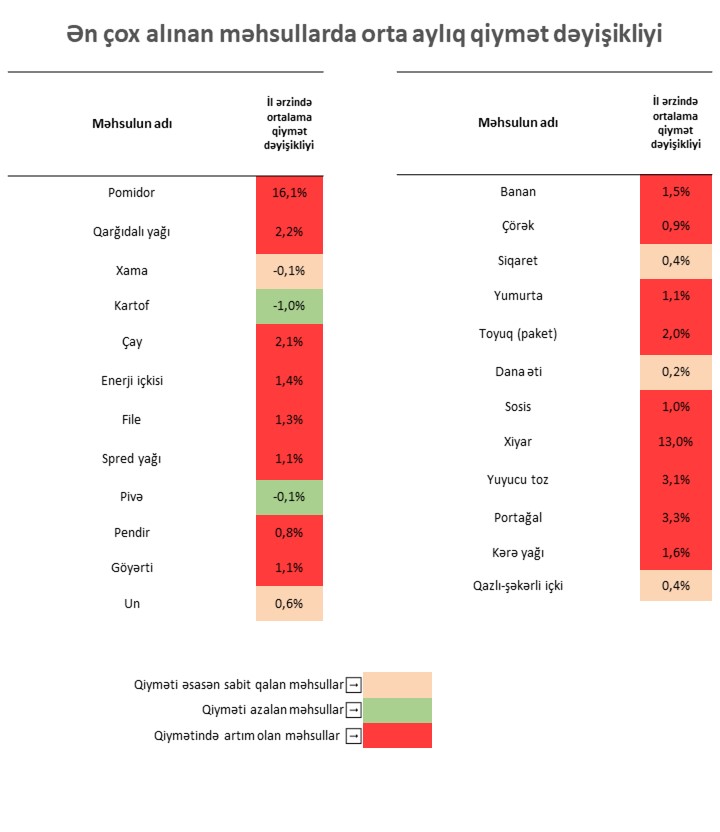 Hesabatda il ərzində Veysəloğlu Pərakəndə İndeksinin alt kateqoriyalarında qiymət dəyişikliyini, məhsul kateqoriyalarının orta illik qiymət dəyişikliyini və ən çox alınan məhsullarda orta aylıq qiymət dəyişikliyini qrafik və cədvəllərdə aydın şəkildə görmək mümkündür.