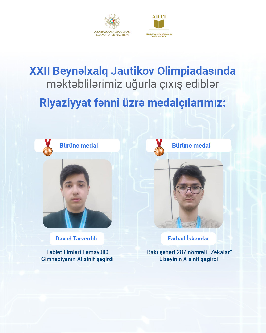 Riyaziyyat fənni üzrə Təbiət Elmləri Təmayüllü Gimnaziyanın XI sinif şagirdi Davud Tarverdili və Bakı şəhəri 287 nömrəli “Zəkalar” Liseyinin X sinif şagirdi Fərhad İskəndər bürünc medal qazanıblar.