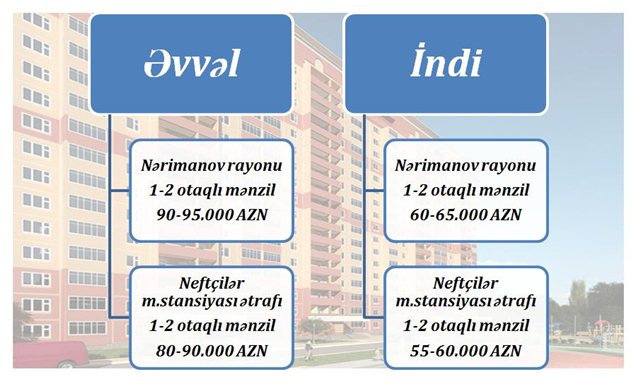 "Daşınmaz əmlak bazarında hələ belə durğunluq olmamışdı. Mənzillərin qiyməti hər gün bir az da aşağı düşür. Məsələn, Nərimanovda 90-95 min manata satılan 1 və ya 2 otaqlı mənzillər indi 60-65 minə təklif edilir. Kifayət qədər ucuzlaşma olsa da, bir dənə də olsun alıcı yoxdur. Demək olar ki alqı-satqı dayanıb".