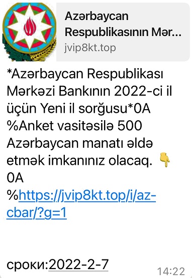 Sosial şəbəkələrdə “Azərbaycan Mərkəzi Bankının 2022-ci il üçün yeni il sorğusu” məzmununda saxta məlumat və spam keçidlər yayılıb.