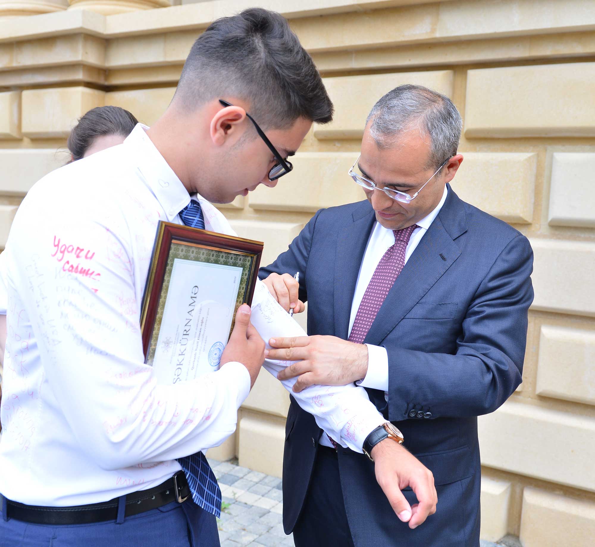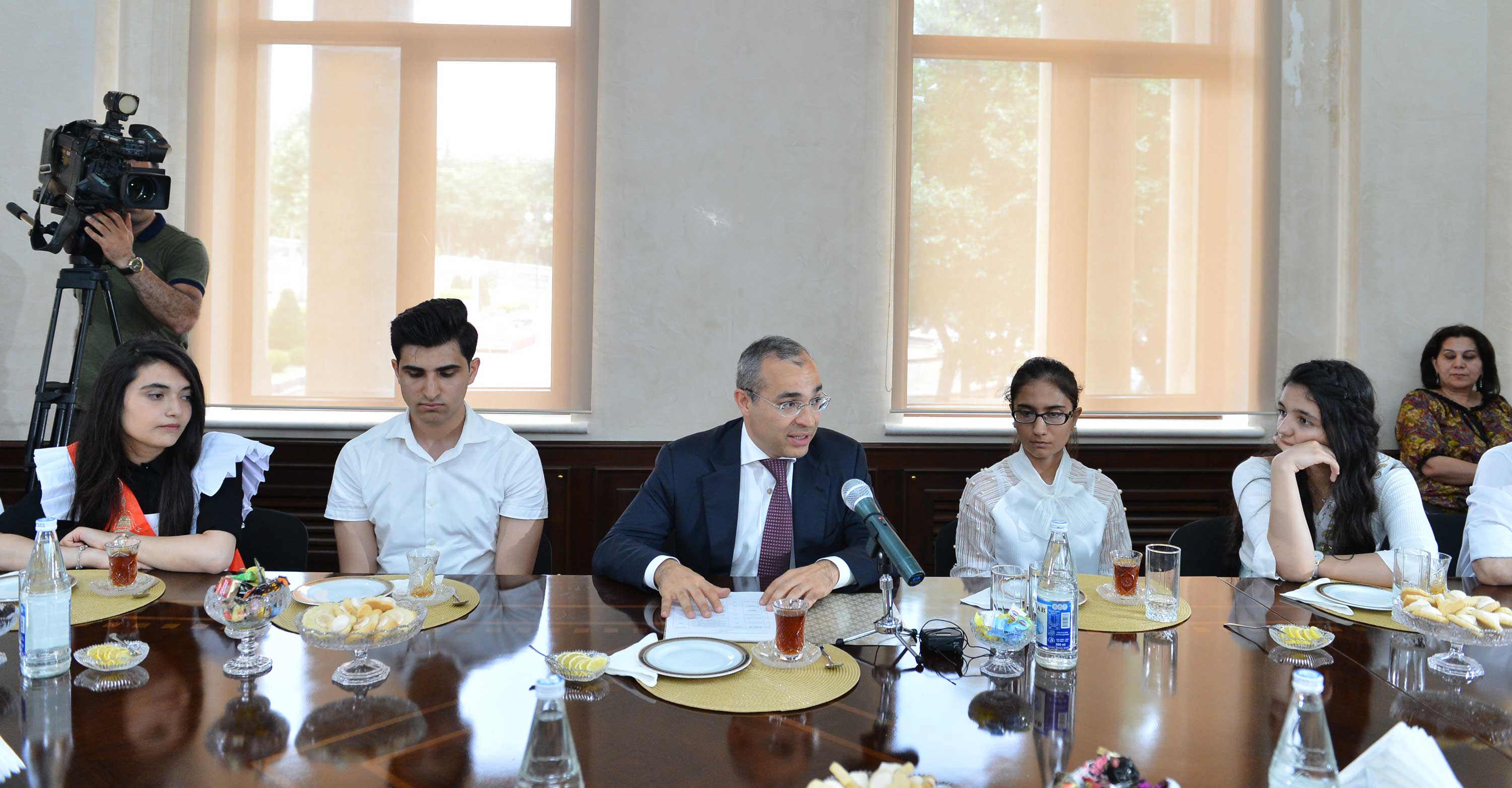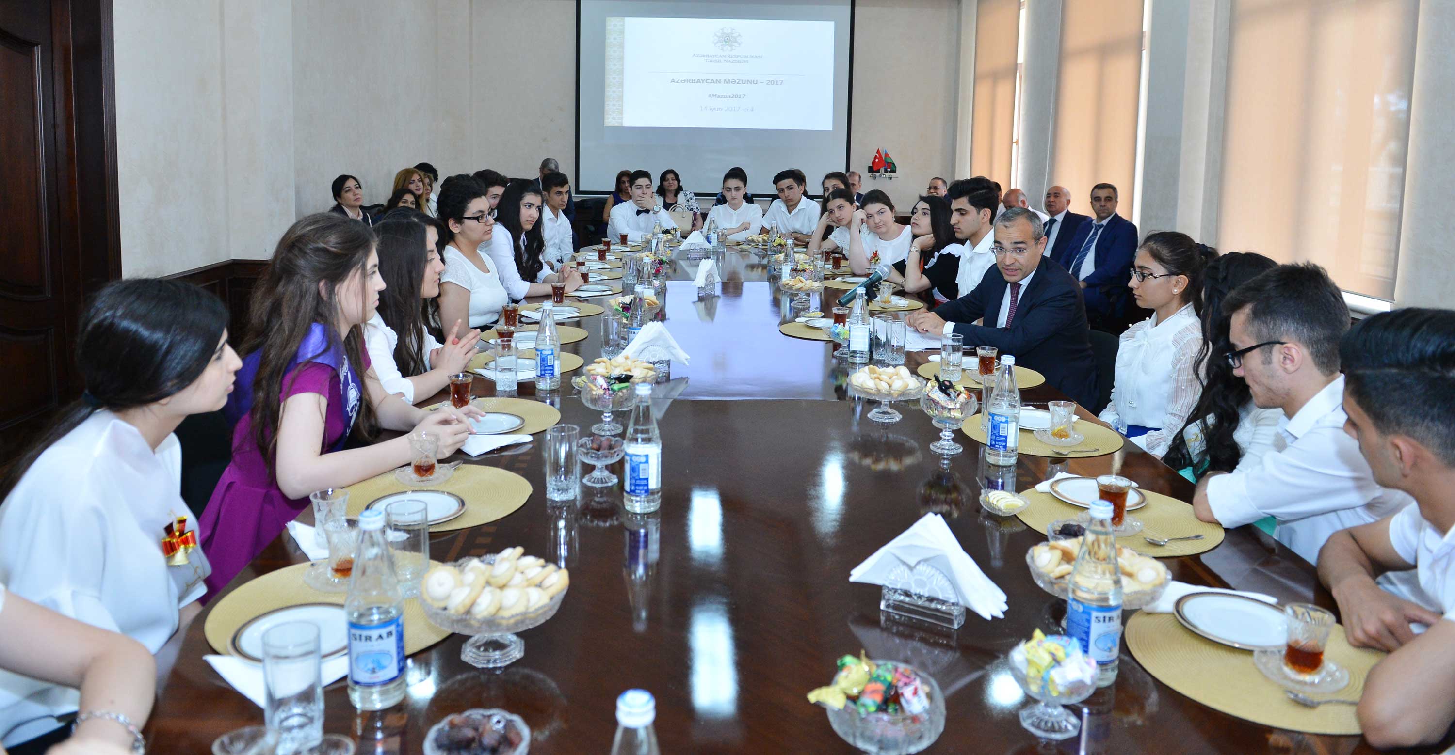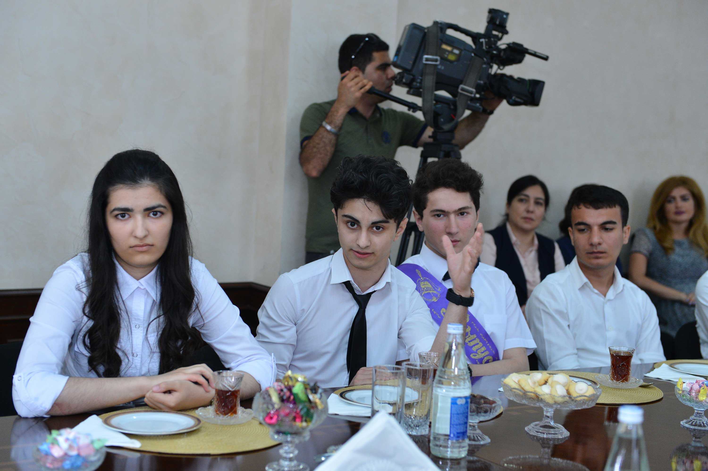 30-dan çox məzunla çay süfrəsi arxasında oturan nazir onları təbrik edib və gələcək həyatlarında uğurlar arzulayıb.