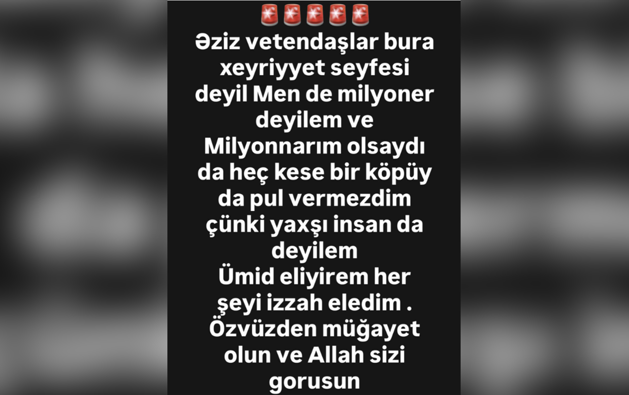 O qeyd edib ki, insanların çoxu ona yazıb pul istəyir: “Əziz vətəndaşlar, bura xeyriyyə səhifəsi deyil. Mən də milyonçu deyiləm. Milyonlarım olsaydı da, heç kimə bir qəpik verməzdim. Çünki yaxşı insan da deyiləm. Ümid edirəm hər şeyi izah etdim. Özünüzdən muğayat olun və Allah sizi qorusun”.
