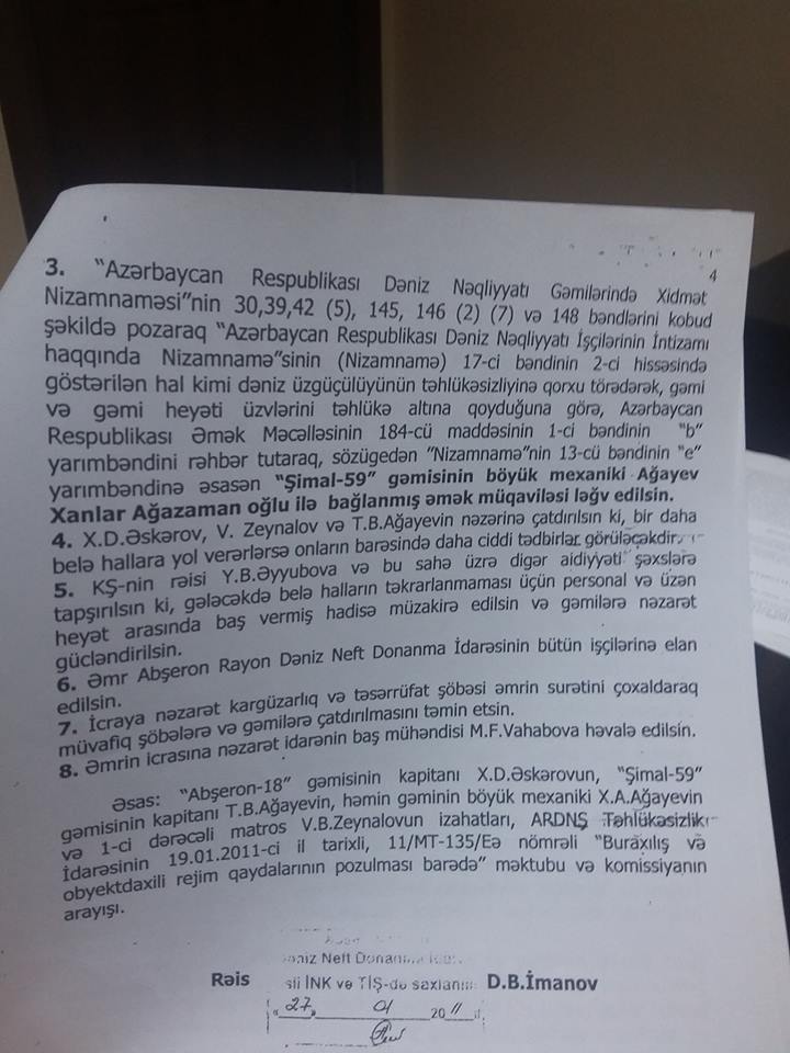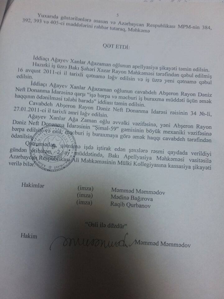 Xanlar Ağayevi həmin əşyanı gəmiyə gətirdiyinə görə işdən qovublar: “Mənim işdən çıxarılma əmrində göstərilib ki, Nizamnamənin 13-cü bəndinin “e” yarımbəndinə əsasən, yəni işçilərin həyatını təhlükə altında qoyduğum üçün çıxarılmışam. Xəzər rayon məhkəməsi şikayət ərizəmi təmin etmədi, apellyasiya şikayəti verdim. Orda mən məhkəməni uddum, qərara görə, İdarənin mənim işdən çıxarılmağım barədə qərarı və Xəzər rayon məhkəməsinin qərardadı ləğv edildi. Qərarda göstərilib ki, bu müddət ərzində işsiz qaldığım ayların əmək haqqısı idarə tərəfindən ödənilsin. Bu qərar 2011-ci ilin noyabrında verildi, amma 8 ay sonra sonra Donanma İdarəsi Ali Məhkəməyə şikayət verib Apellyasiyanın həmin qərarını ləğv etdirdi. Halbuki bu da qanunsuz idi, çünki 2 ay ərzində şikayət verilməli idi.