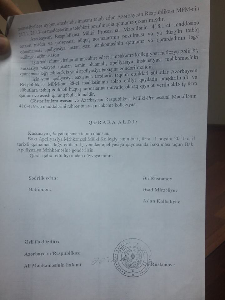 Ali məhkəmə işi təkrar apellyasiyaya göndərdi, bu dəfə Apellyasiya Məhkəməsinin hakimi Cəmilə Səfiyeva qərar çıxardı ki, Abşeron Rayon Dəniz Neft Donanma İdarəsinin mənim işdən çıxarılmağım barədə əmrinə düzəliş edilsin və mən 13-cü yox, 70-ci maddəsinin “c” bəndinə görə işdən azad olunum. Bu necə mümkündür ki, məhkəmə İdarəyə məni hansı maddə ilə işdən azad edilməyimi təklif edir? Mən 4 ildir qanunsuz olaraq işsizəm, oğlumu da işsiz qoyublar. Ailəmiz faktiki olaraq acından ölür”.