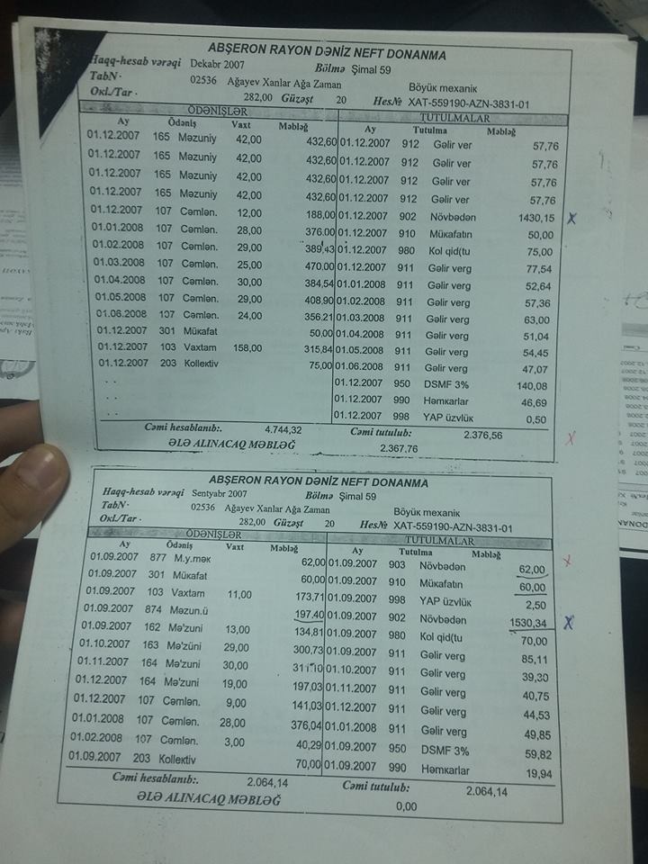 Xanlar Ağayev iddia etdiyi kimi İdarə rəhbərliyinin ona qarşı qərəzli mövqeyinin səbəbini onun yuxarı qurumlara yazdığı şikayətlərlə əlaqələndirir: “İdarənin rəisi Damət İmanov məndən 1000 manat pul aldı və dedi oğlumu kursa göndərəcək. Mənə dedi ki, bu pul kursun ödənişidir, kurs başa çatandan sonra da oğlumu işə götürəcək. Amma 7-8 ay keçsə də, nə oğlum kursa getdi, nə pulumu qaytardı. Mən də o vaxtkı rəis Mübariz Mədətova şikayət etdim. Onun tapşırığı ilə oğlum işə götürüldü. Mübariz müəllim dedi ki, əgər Damət sizi incitsə, mənə deyin. Mübariz müəllim vəzifədən gedən kimi Damət İmanov oğlumu işdən çıxartdı. Bundan başqa idarədəki yeyintilər, saxtaklarlıqlar barədə yuxarı qurumlara şikayətlər yazırdım. Rəhbərliyin qanunsuz hərəkətləri, işçilərlə kobud davranışı, mənə verilməli olan məzuniyyət pullarının mənimsənilməsi ilə bağlı Milli Təhlükəsizlik Nazirliyinə şikayətlər göndərmişəm. İkiqat ödənişlər, məzuniyyət pullarım düzgün ödənilmirdi, əlavə saxlayıb işlədirdilər, pulunu ödəmirdilər. MTN-ə yazandan sonra mənə qarşı bu planı qurdular. Həmin vaxt idarədə 400 min manatlıq yeyinti vardı. İdarə tərəfindən bizə qaimələr verilib. Özünüz də görürsünüz, 2008-ci ilin dekabrında mənə 1458 manat maaş yazılıb, onun 912 manatını tutub, mənə 546 manat pul veriblər. 2007-ci ilin dekabrında “Haqq-hesab vərəqi” hazırlanıb, amma orada mənim 2008-ci ildə neçə saat işləyəcəyim, nə qədər mükafat alacağım qeyd olunub. Həmin hesabatda göstərilib ki, mənim növbədə olduğum saatdan 1430 manat tutulub. Niyə? Bunu heç kim açıqlamır. Çünki yeyintiləri işçilərdən tutub bağlamaq istəyirdilər. Mən də bunlardan MTN-ə, Baş Prokurorluğa, Daxili İşlər Nazirliyinə rəsmi şikayətlər göndərdim. Sonra da başıma bu oyunu açdılar”.