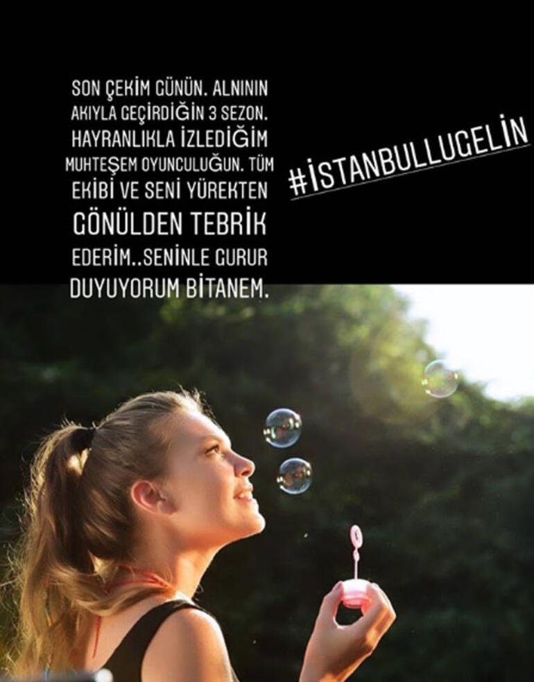 “Sonuncu çəkiliş günündür. Alnıaçıq keçirdiyin 3-cü mövsüm. Heyranlıqla izlədiyim möhtəşəm aktrisalığın... Bütün kollektivi və səni ürəkdən təbrik edirəm. Səninlə qürur duyuram, bir dənəm!”.