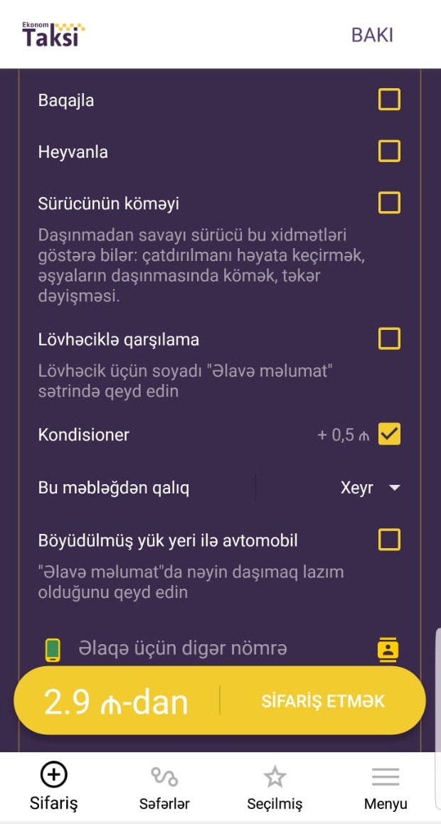 “Bu, bizim mobil tətbiqimizdə də göstərilib. Müştəri əgər kondisionerdən istifadə etmək istəyirsə, bu zaman müvafiq seçim edir. Amma burada insan faktoru da önəmlidir. Məsələn, müştəri əyləşdiyi taksidə kondisioner işlək vəziyyətdədirsə, bu zaman heç bir ödəniş etmir. Lakin elə sürücülər var ki, kondisionerdən istifadənin əlavə yanacaq sərfiyyatına səbəb olduğunu nəzərə alaraq, bundan imtina edir. Belə olan halda, müştəri əlavə 50 qəpik ödəməklə sürücüdən kondisioneri işə salmağını tələb edə bilər”.
