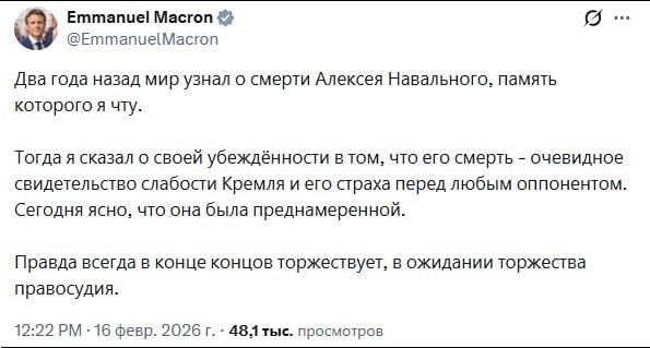“Dünya iki il əvvəl xatirəsini hörmətlə yad etdiyim Aleksey Navalnının ölümü barədə öyrəndi. O zaman mən onun ölümünün Kremlin zəifliyinin və istənilən rəqibdən qorxusunun açıq-aşkar sübutu olduğuna əminliyimi ifadə etmişdim. Bu gün bəllidir ki, bu, qəsdən edilmişdi. Həqiqət hər zaman sonda qalib gəlir, ədalətin də zəfər çalmasını gözləyirik”, - Fransa prezidenti yazıb.