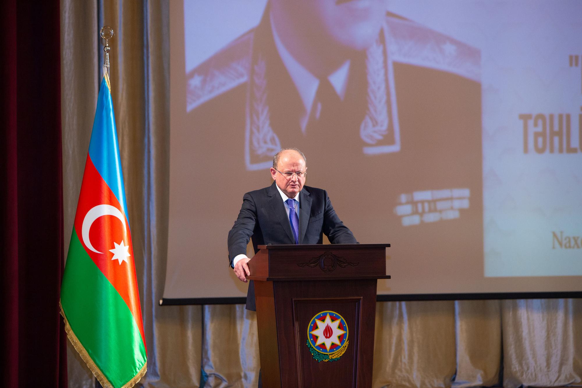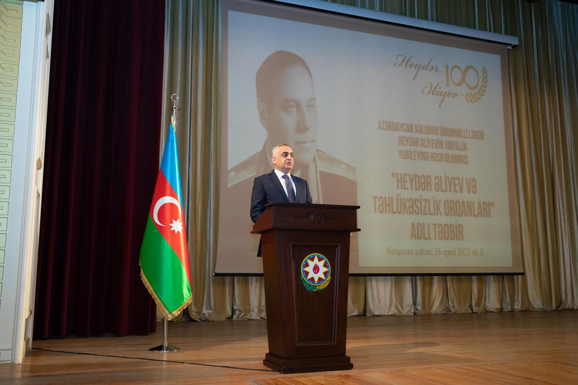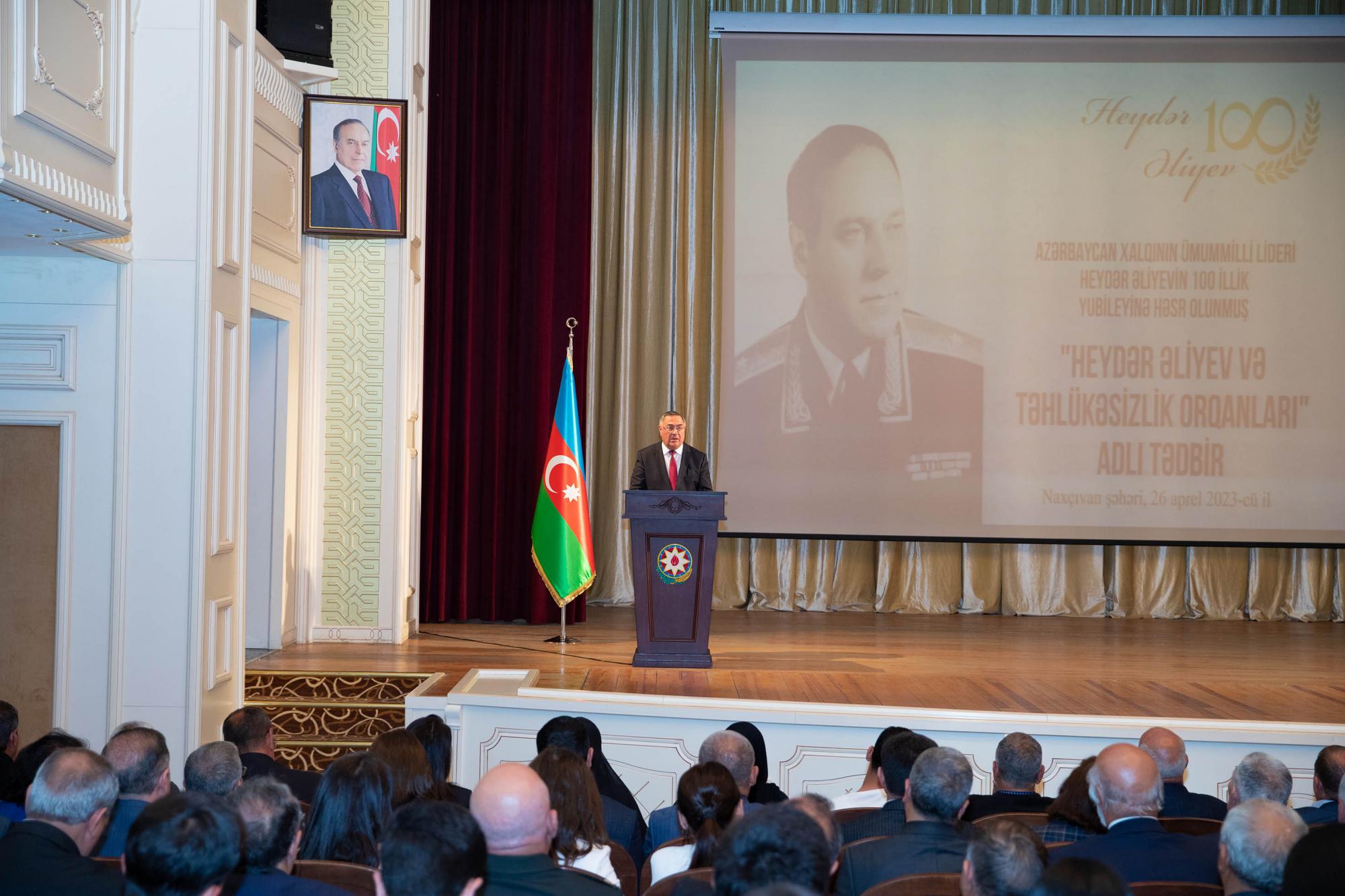 Aprelin 26-da Naxçıvan şəhərində “Heydər Əliyev və təhlükəsizlik orqanları” adlı təntənəli tədbir keçirilib. Tədbirdə Prezidentin Naxçıvandakı səlahiyyətli nümayəndəsi Fuad Nəcəfli, DTX-nin rəhbər şəxsləri və əməkdaşları, şəhərin hüquq-mühafizə orqanlarının rəhbərləri, təhlükəsizlik orqanlarının veteranları, Vətən müharibəsi iştirakçıları, şəhid ailəsi üzvləri və ictimaiyyət nümayəndələri iştirak ediblər. Fuad Nəcəfli tədbirin Ulu Öndərin böyüyüb boya-başa çatdığı Naxçıvanda keçirilməsinin önəminə toxunub. O, Heydər Əliyevin ömür yoluna nəzər salaraq təhlükəsizlik orqanlarında fəaliyyəti və Azərbaycanın rəhbəri olaraq xidmətləri barədə ətraflı məlumat verib. Ölkəmizin milli tərəqqi strategiyasının əsasının məhz Heydər Əliyev tərəfindən qoyulmasından söhbət açıb. Fuad Nəcəfli Prezident İlham Əliyevin rəhbərliyi altında respublikamızın yeni inkişaf mərhələsinə qədəm qoyduğunu və bu siyasət xəttinin ölkəmizin davamlı yüksəlişinə xidmət etdiyini vurğulayıb.