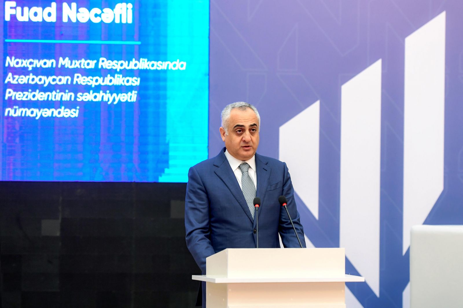 Naxçıvan Muxtar Respublikasında Azərbaycan Prezidentinin səlahiyyətli nümayəndəsi Fuad Nəcəfli Forum iştirakçılarını salamlayaraq Naxçıvanın muxtariyyət və inkişaf tarixinə nəzər salıb. Qeyd edib ki, Naxçıvan muxtariyyət qazandıqdan sonra 1970-ci ilə qədər məqsədli şəkildə inkişafdan kənarda saxlanılıb. Lakin Ümummilli Liderimiz Heydər Əliyevin Azərbaycana birinci rəhbərliyi dövründə muxtar respublikanın həyatında yeni mərhələ başlanıb. Ulu Öndərin 1990-1993-cü illərdə Naxçıvanda yaşayıb fəaliyyət göstərməsi isə muxtar respublikanı növbəti işğal təhlükəsindən qoruyub, müstəqil dövlətçiliyimizin əsasları bu torpaqda işlənib hazırlanıb. Bu gün 100 illik muxtariyyət tarixini qeyd edən Naxçıvan Zəngəzur dəhlizinin açılması və Dövlət Proqramının icrası perspektivlərində daha böyük inkişaf və tərəqqiyə hədəflənib.Bu da müdrik dövlət xadimi, ölkə Prezidenti cənab İlham Əliyevin liderlik fəaliyyətinin nəticəsidir.