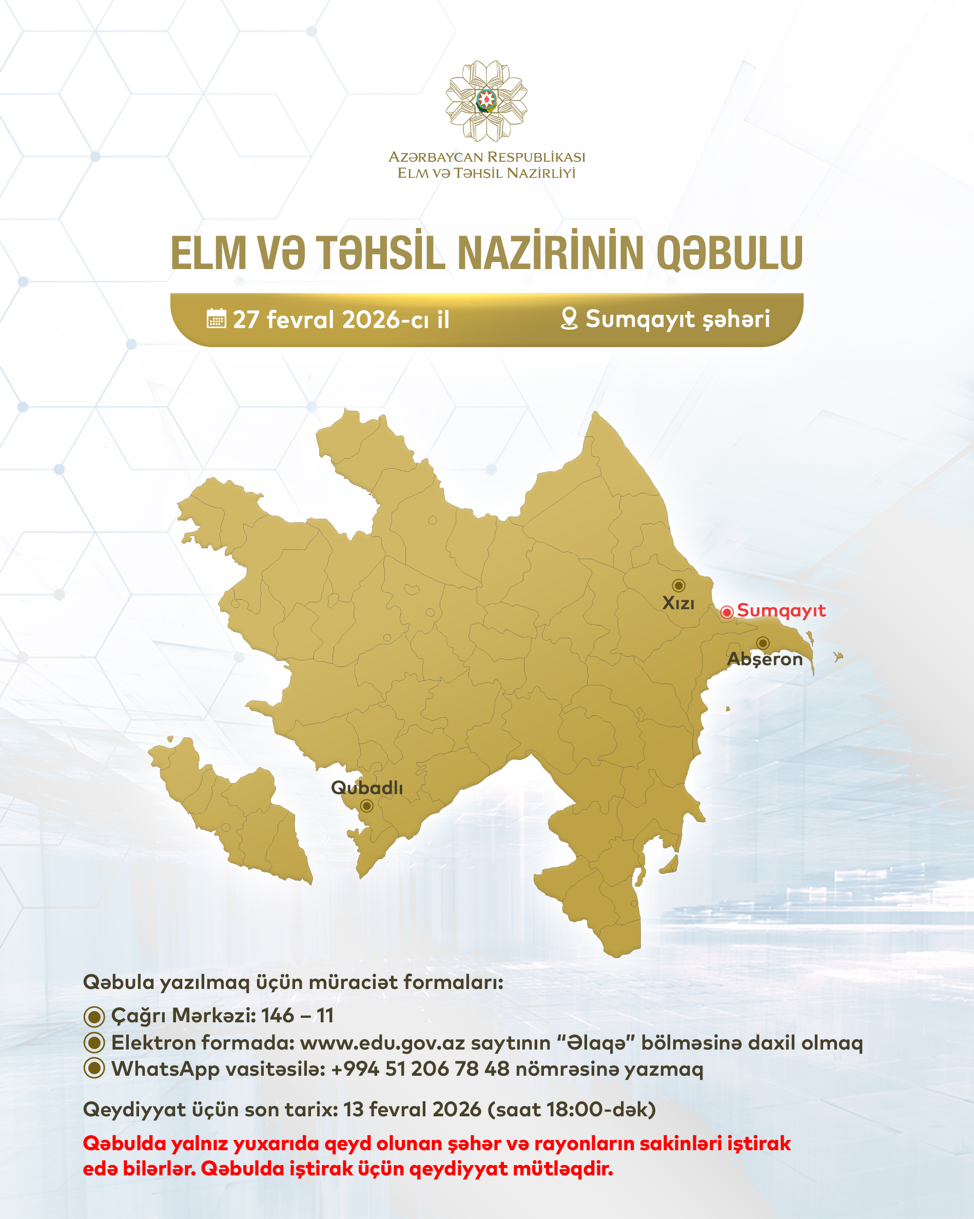 Adları çəkilən şəhər və rayonların sakinləri fevralın 13-dək (saat 18:00-dək) Elm və Təhsil Nazirliyinin Çağrı Mərkəzinin 146 – 11 nömrəli telefonuna (yalnız iş günləri və saatları ərzində) zəng etməklə qəbula yazıla bilərlər.