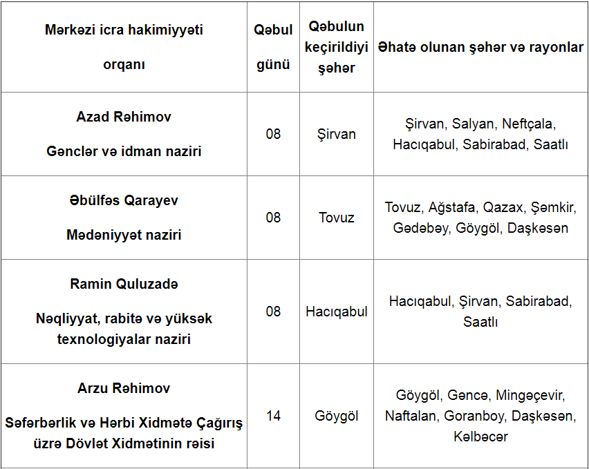 Azərbaycanın mərkəzi icra hakimiyyəti orqanlarının rəhbərlərinin 2019-cu ilin fevral ayında şəhər və rayonlarda vətəndaşların qəbulu cədvəli açıqlanıb.