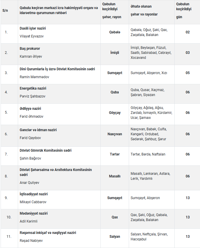 Mərkəzi icra hakimiyyəti orqanlarının və digər idarəetmə qurumlarının rəhbərləri tərəfindən 2026-cı ilin fevral ayında şəhər və rayonlarda keçiriləcək vətəndaşların qəbulu cədvəli açıqlanıb.