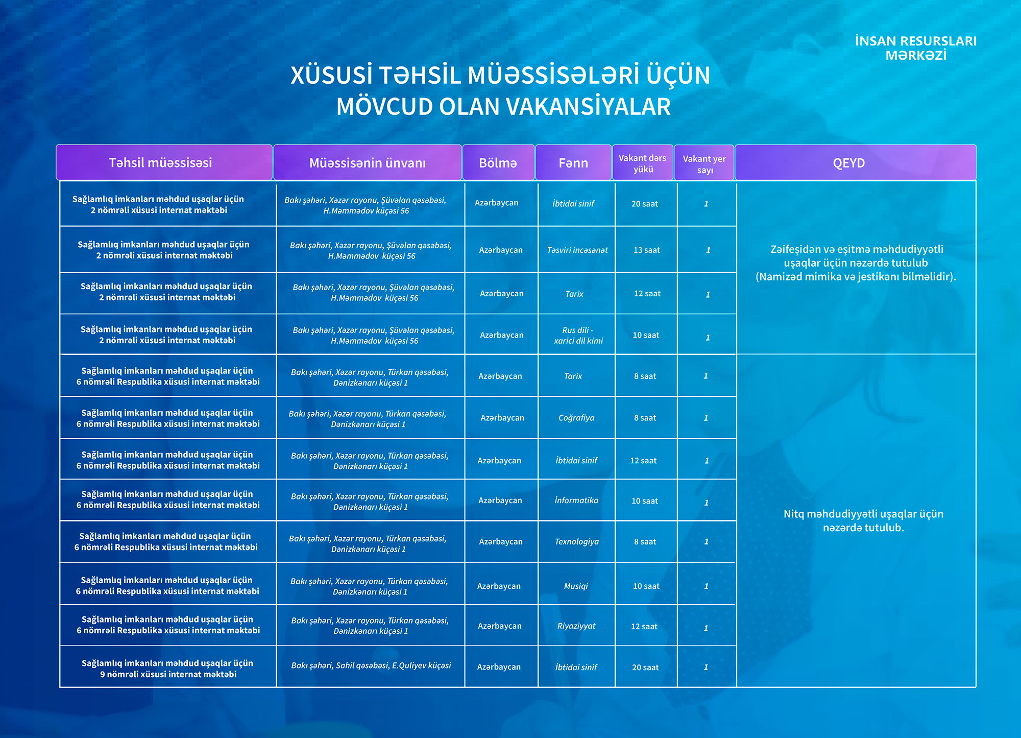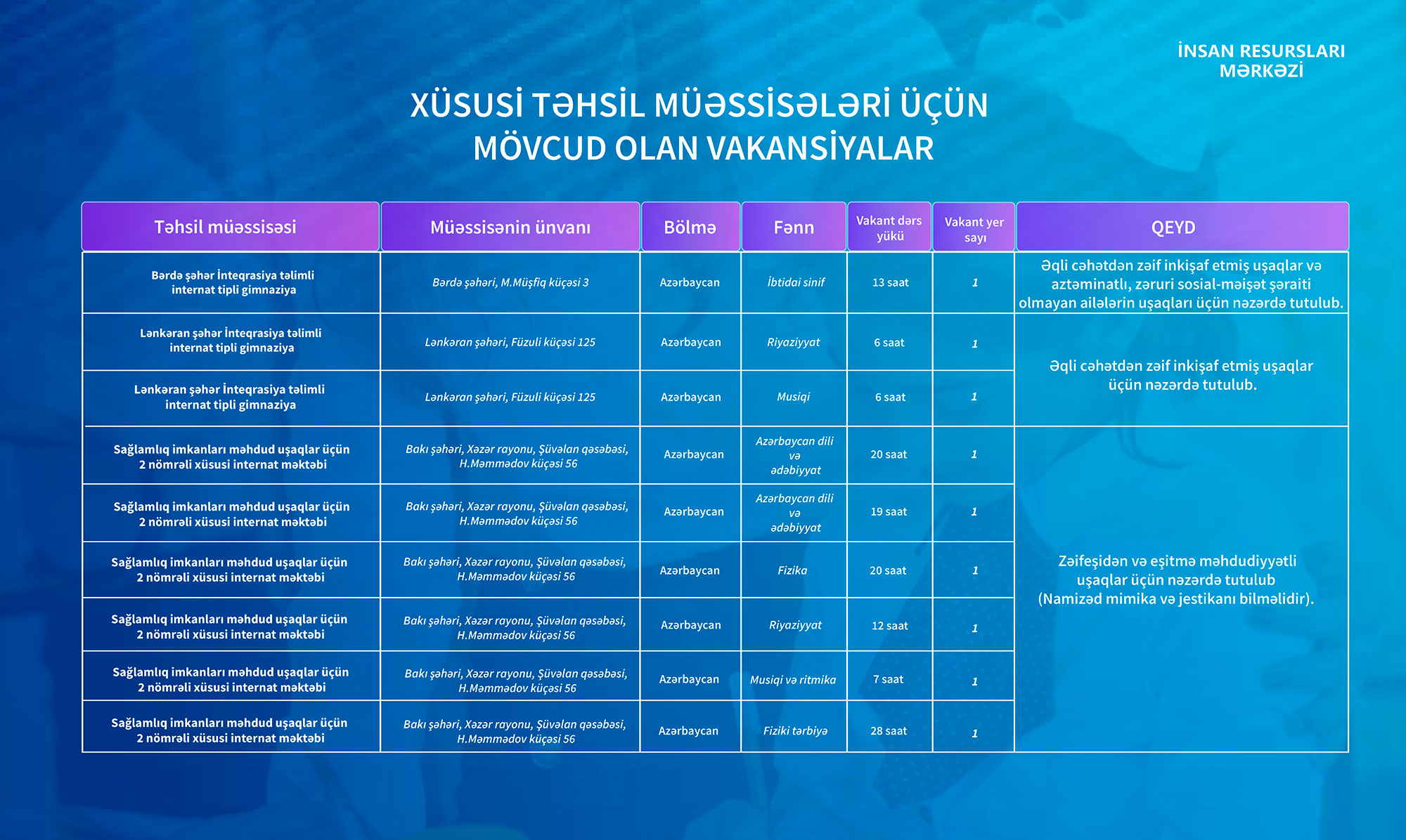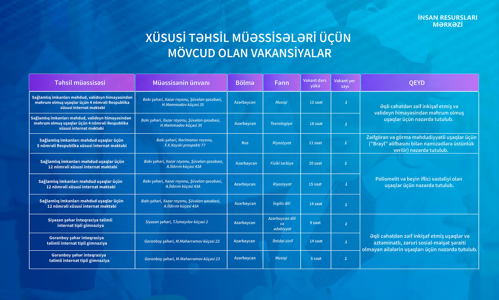 Qeyd olunan təhsil müəssisələri üzrə mövcud vakansiyalar aşağıdakı cədvəldə təqdim edilib.