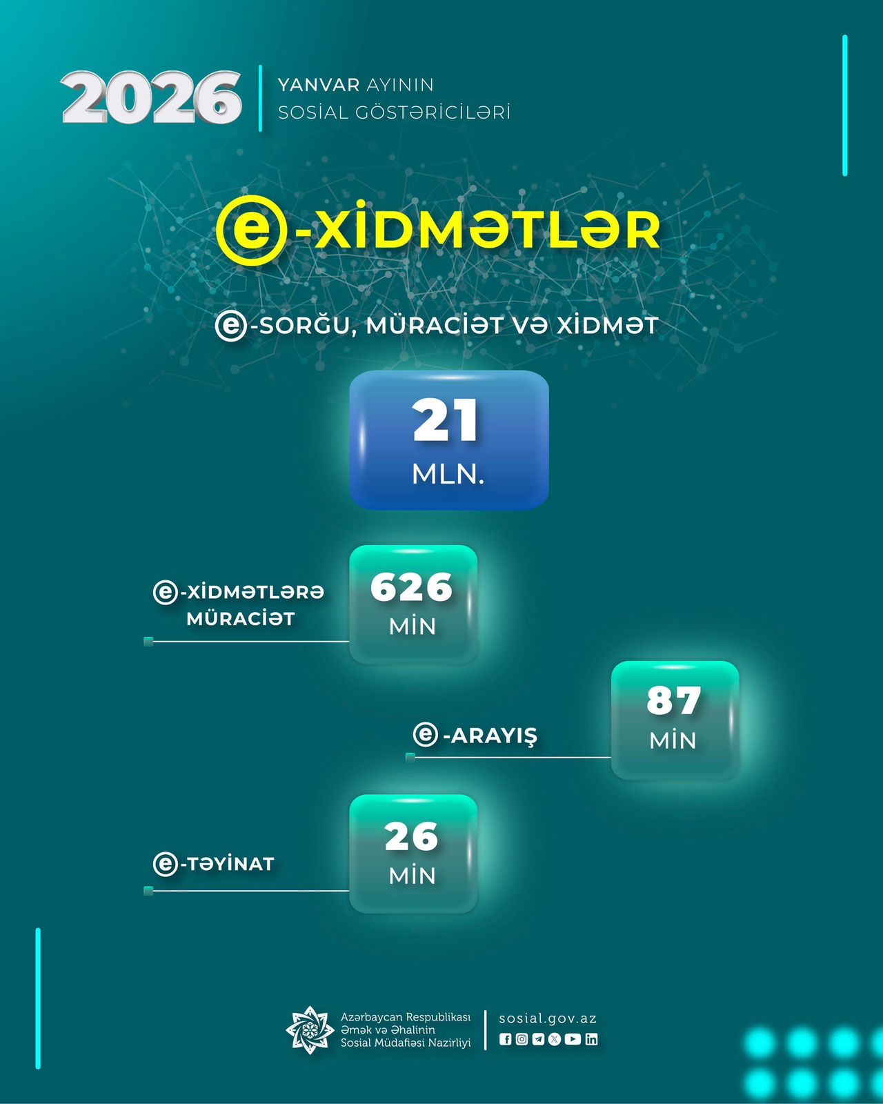 Əmək və Əhalinin Sosial Müdafiəsi Nazirliyinin fəaliyyət sahələri üzrə əhaliyə təqdim olunan elektron xidmətlərə 2026-cı ilin yanvar ayında 626 min müraciət edilib.
