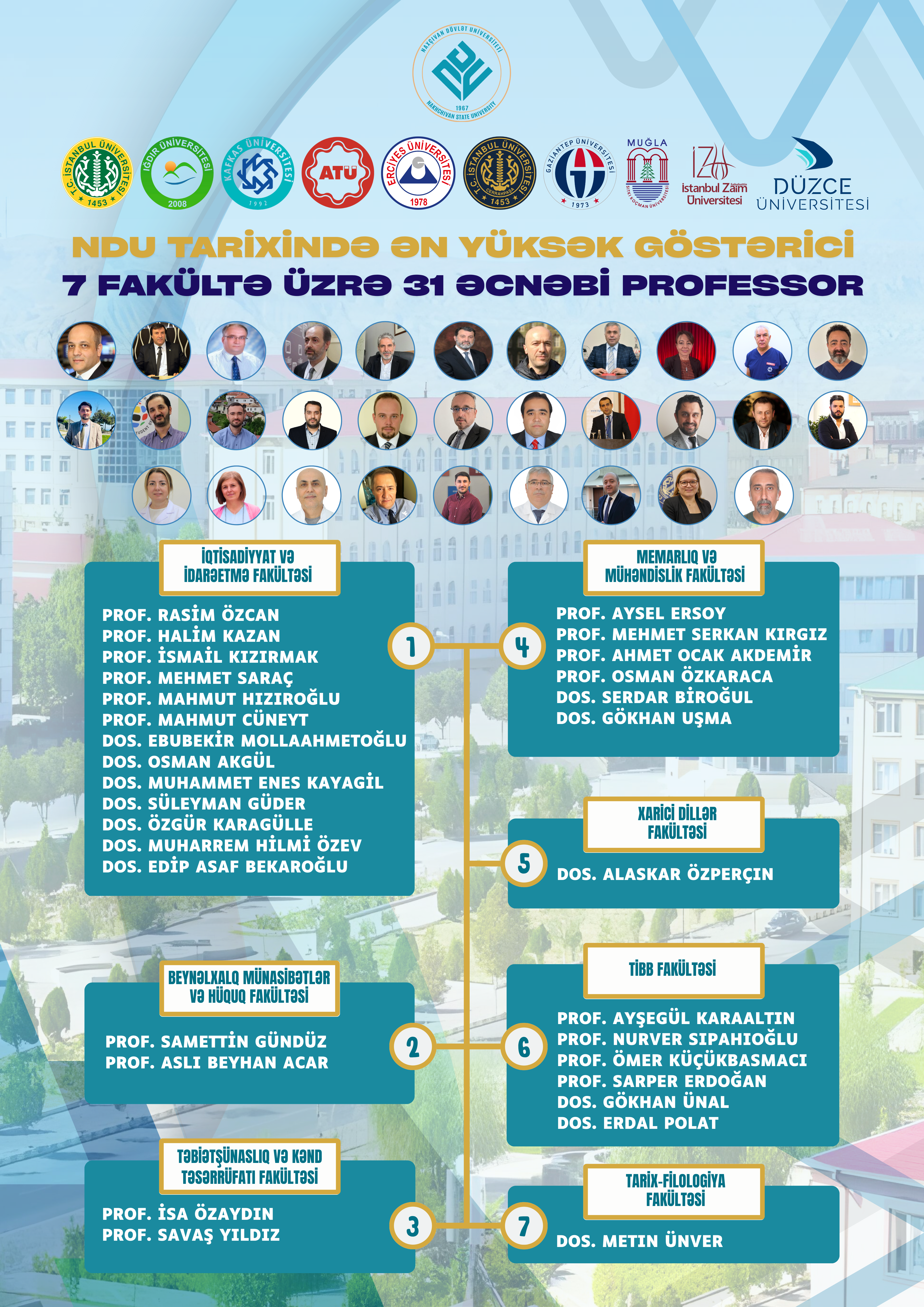 Bu göstərici NDU tarixində əcnəbi akademiklərin tədrisə cəlbində say olaraq ən yüksək göstəricidir. Nüfuzlu universitetlərdən olan alimlər iqtisadiyyat, hüquq, mühəndislik, tibb və digər sahələr üzrə dərslər deyəcəklər. Əcnəbi professorların təkcə tədris sahəsində deyil, həm də beynəlxalq qrant layihələrinin hazırlanması və birgə elmi araşdırmaların aparılmasında da fəal iştirakı planlaşdırılır. Bu uğurlu təşəbbüs qlobal bilik və təcrübə mübadiləsi imkanları yaradacaq.