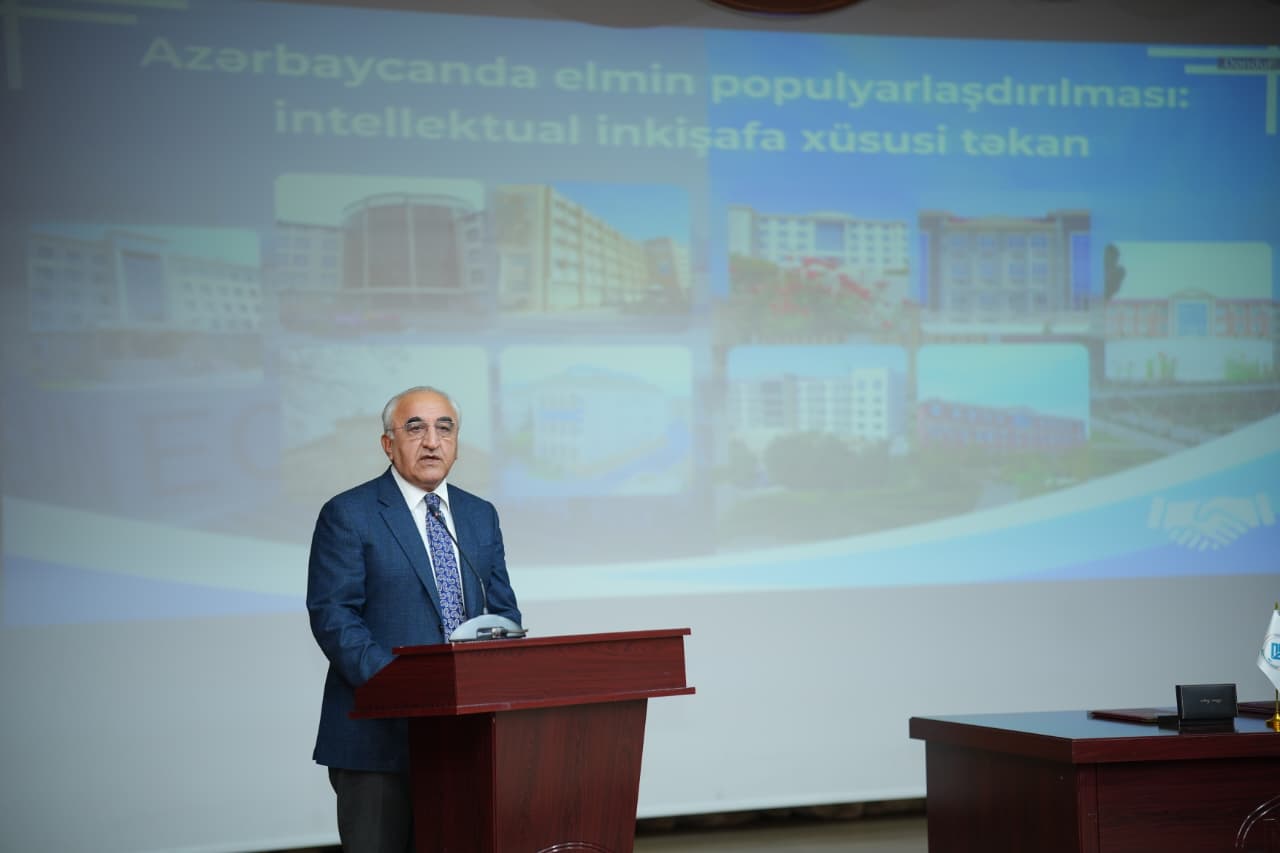 UNEC-in rektoru Ədalət Muradov çıxışında görüşdən məmnunluğunu bildirib, rəhbərlik etdiyi ali təhsil müəssisəsinə dair məlumatları bölüşüb, elmin inkişafı üçün atılan addımlardan danışıb. UNEC-in “Elmin populyarlaşdırılması” layihəsindən bəhs edərək bu layihənin elmin cəlbediciliyini və gənc nəslin elmə marağının artırılması məqsədi daşıdığını qeyd edib. Azərbaycan alimlərinin, onların kitablarının cəmiyyətə tanıdılmasının da əsas missiyalardan biri olduğunu vurğulayıb. Ədalət Muradov NDU haqqında təəssüratlarından danışıb: “Naxçıvan Dövlət Universiteti, həqiqətən də, böyük uğurlara imza atan universitetdir”,- deyə qeyd edib.
