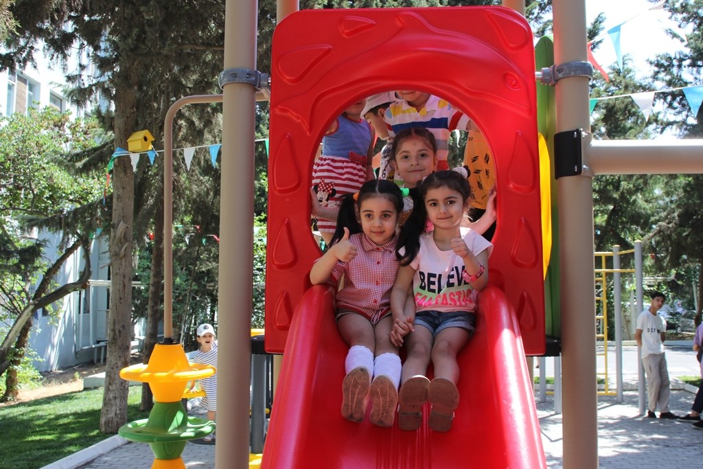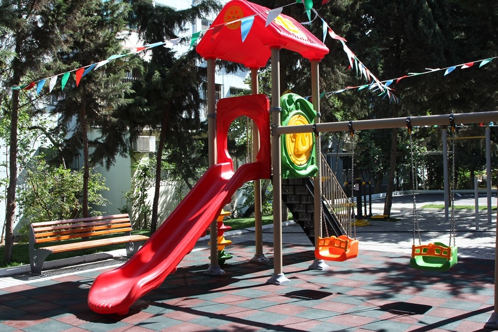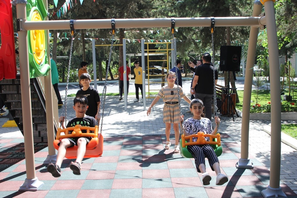 Sakinlərin asudə vaxtlarının səmərəli təşkili üçün binanın həyətinə söhbətgah və oturacaqlar qoyulub, müxtəlif növ uşaq oyun elementləri və idman qurğuları quraşdırılıb.