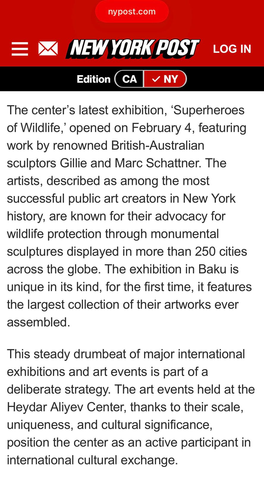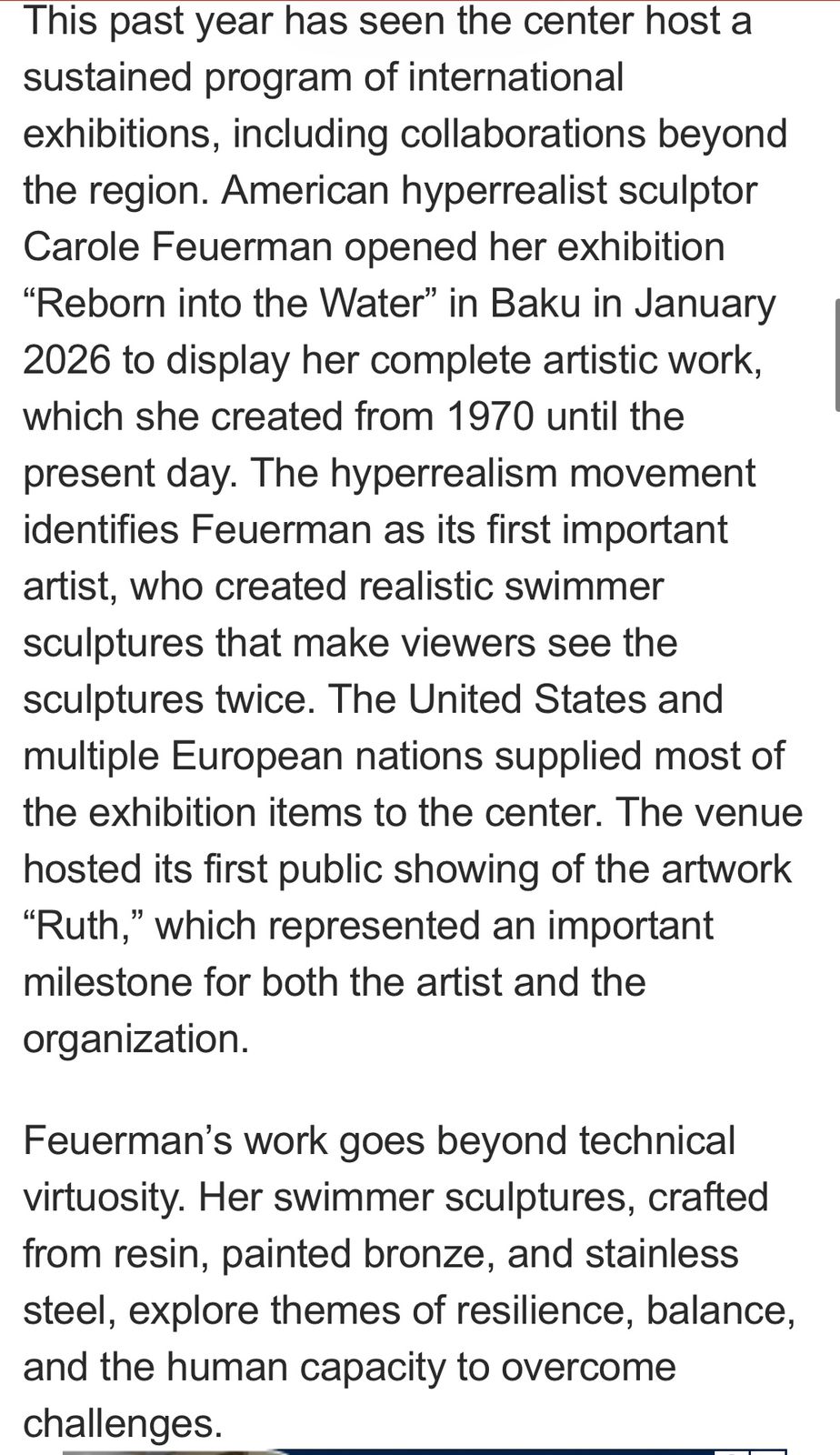 “New York Post”da bu əsnada son dövrlərdə beynəlxalq incəsənət layihələri - Amerikanın hiperrealist heykəltəraşı Kerol Förmen, məşhur britaniyalı və avstraliyalı heykəltaraşlar Cili və Mark Şatner, kolumbiyalı rəssam - heykəltaraş, insanları və heyvanları, eləcə də müxtəlif fiqurları nəhəng ölçüdə canlandıran Fernando Boteronun Heydər Əliyev Mərkəzində təqdim olunan sərgiləri xüsusilə vurğulanıb.