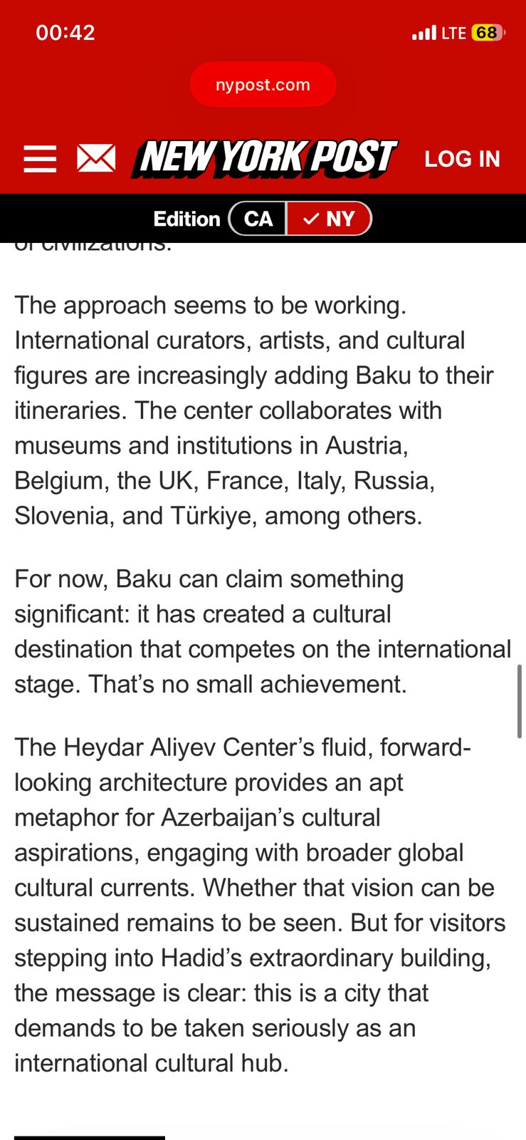 “Əlamətdar haldır ki, Mərkəzdə ilk böyük incəsənət layihəsi 2013-cü ildə Endi Vorholun “Həyat, ölüm və gözəllik” sərgisi olub. Bakı Avropa və Asiya arasında mədəni körpüdür. Beynəlxalq kuratorlar, rəssamlar və incəsənət xadimləri Bakını öz sənət marşrutlarına daxil edir. Bütün bu trasformasiyanın mərkəzində isə bina olmaqdan da daha əhəmiyyətli rolu olan miqyaslı memarlıq layihəsi - Heydər Əliyev Mərkəzi dayanır”, - “Nyu York Post”un məqaləsində qeyd olunub.