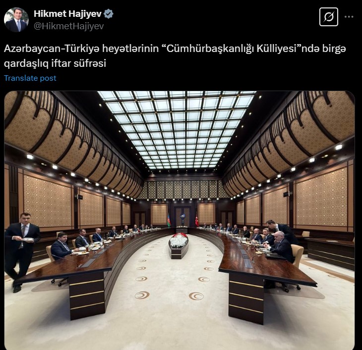 “Azərbaycan-Türkiyə heyətlərinin “Cümhürbaşkanlığı Külliyesi”ndə birgə qardaşlıq iftar süfrəsi”, - paylaşımda deyilir.