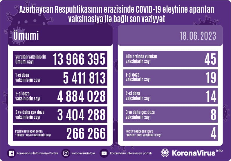 Azərbaycanda son sutkada koronavirus (COVID-19) əleyhinə 45 vaksin vurulub.