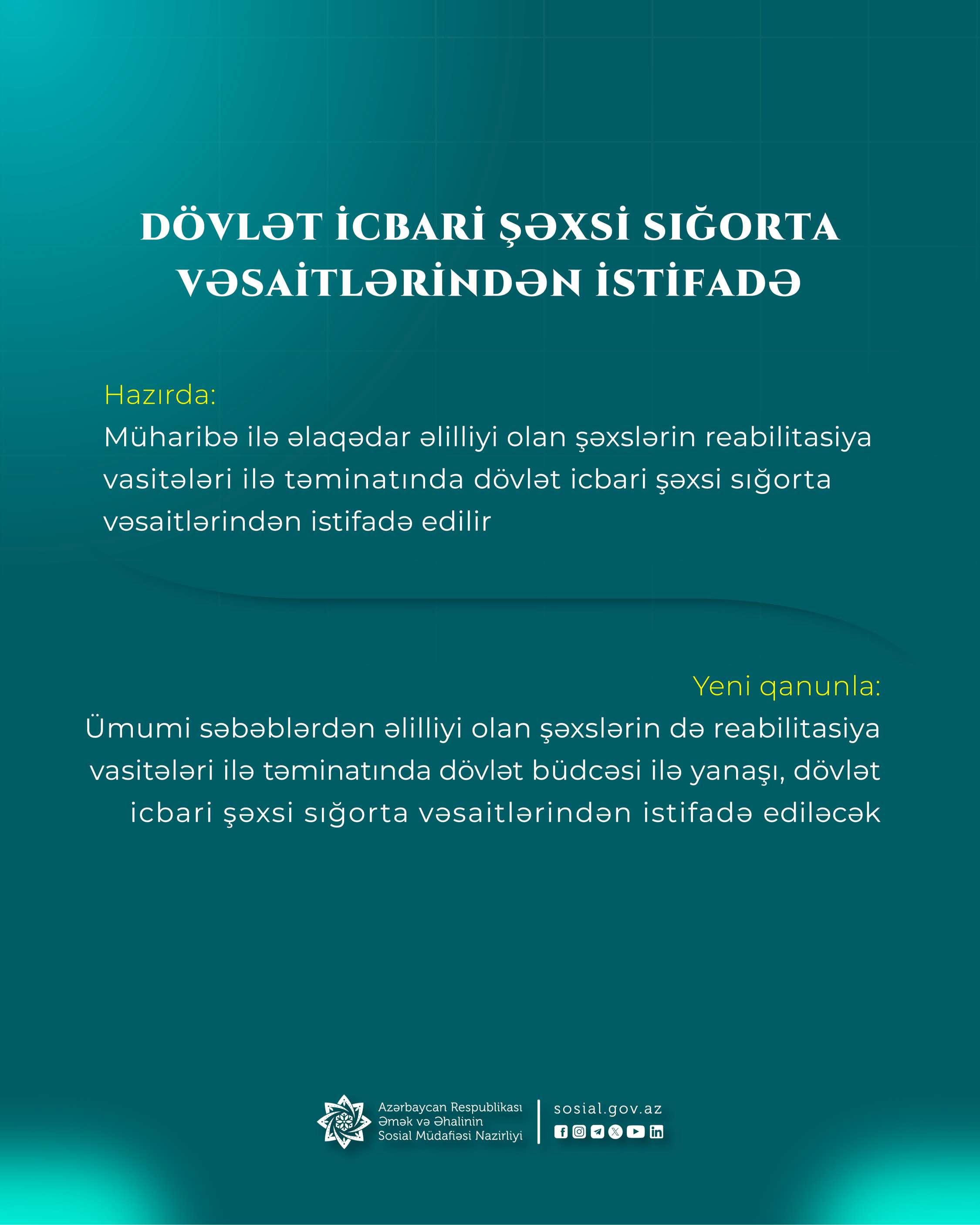 Belə ki, ümumi səbəblərdən əlilliyi olan şəxslərin reabilitasiya vasitələri ilə təminatı dövlət büdcəsi ilə yanaşı, dövlət icbari şəxsi sığorta üzrə toplanan vəsait hesabına da həyata keçiriləcək.