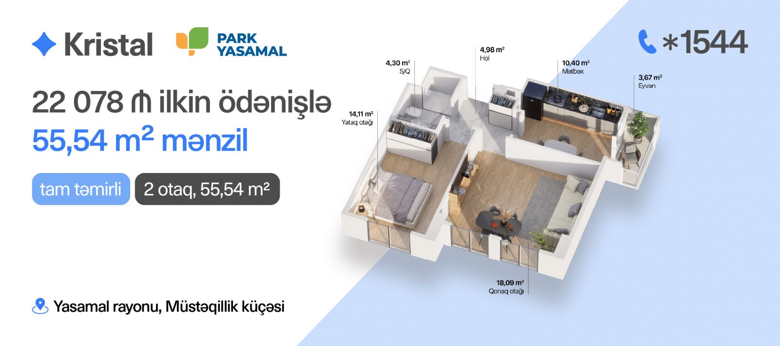 Məsələn, 2 otaq studiya, 42,49 m² mənzilə cəmi 18 165 manat, 2 otaq, 55,54 m² mənzil üçün isə 22 078 manat ilkin ödəniş kifayətdir. Daha yüksək kvadratlı mənzillər üçün də sərfəli şərtlər mövcuddur.