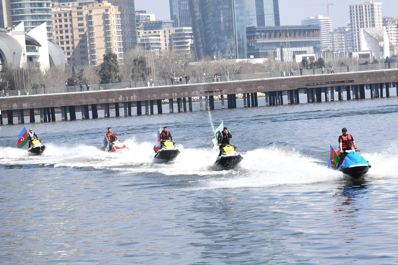 “Qafqazinfo” xəbər verir ki, Bakı bulvarında keçirilən tədbirdə əvvəlcə Azərbaycan bayraqlarını daşıyan skuterlər Xəzər dənizində dövrə vurublar.