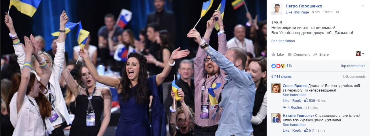 “Belə!!! Möhtəşəm çıxış və qələbə! Camala, bütün Ukrayna sənə ürəkdən minnətdarlığını bildirir!”