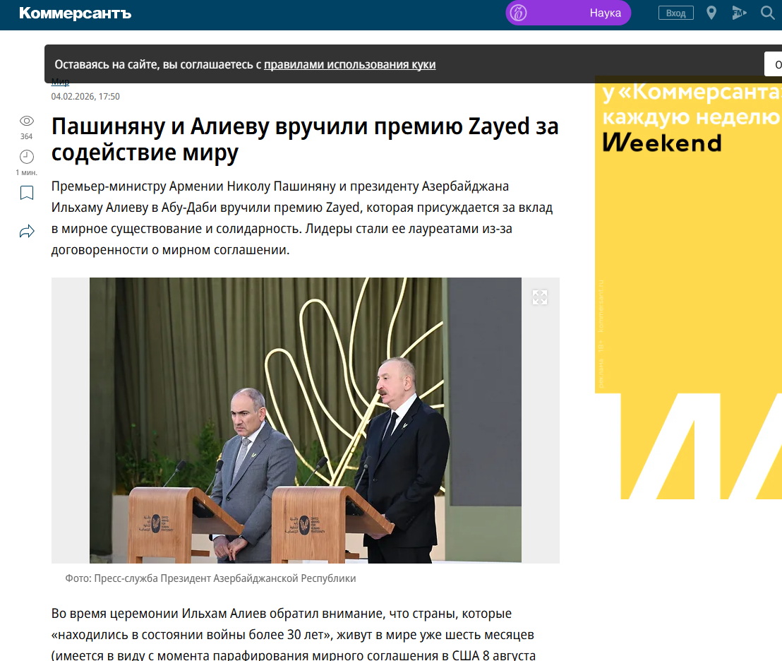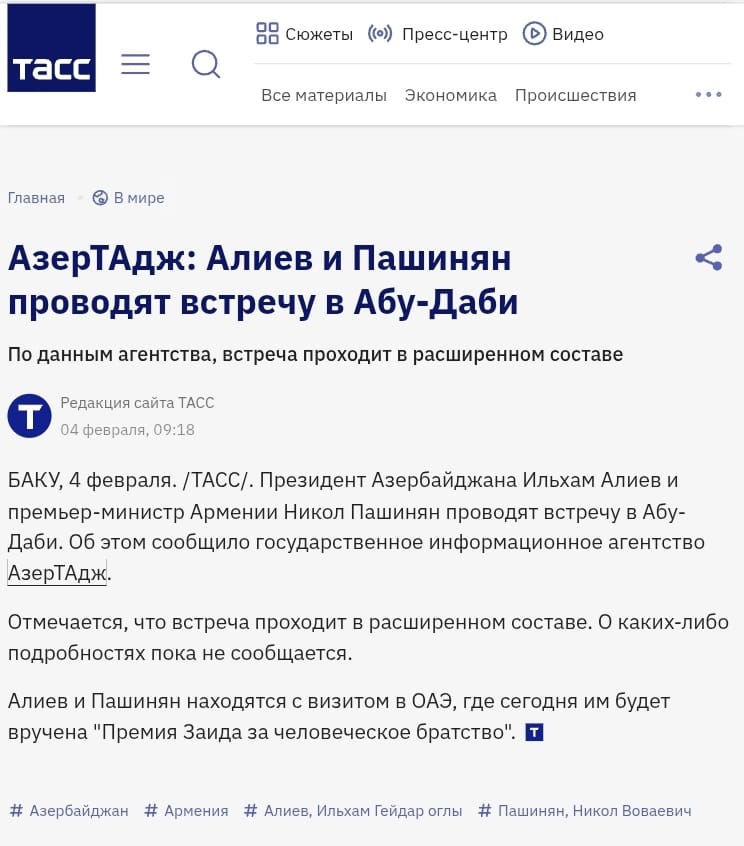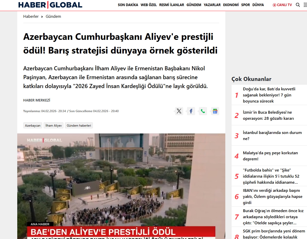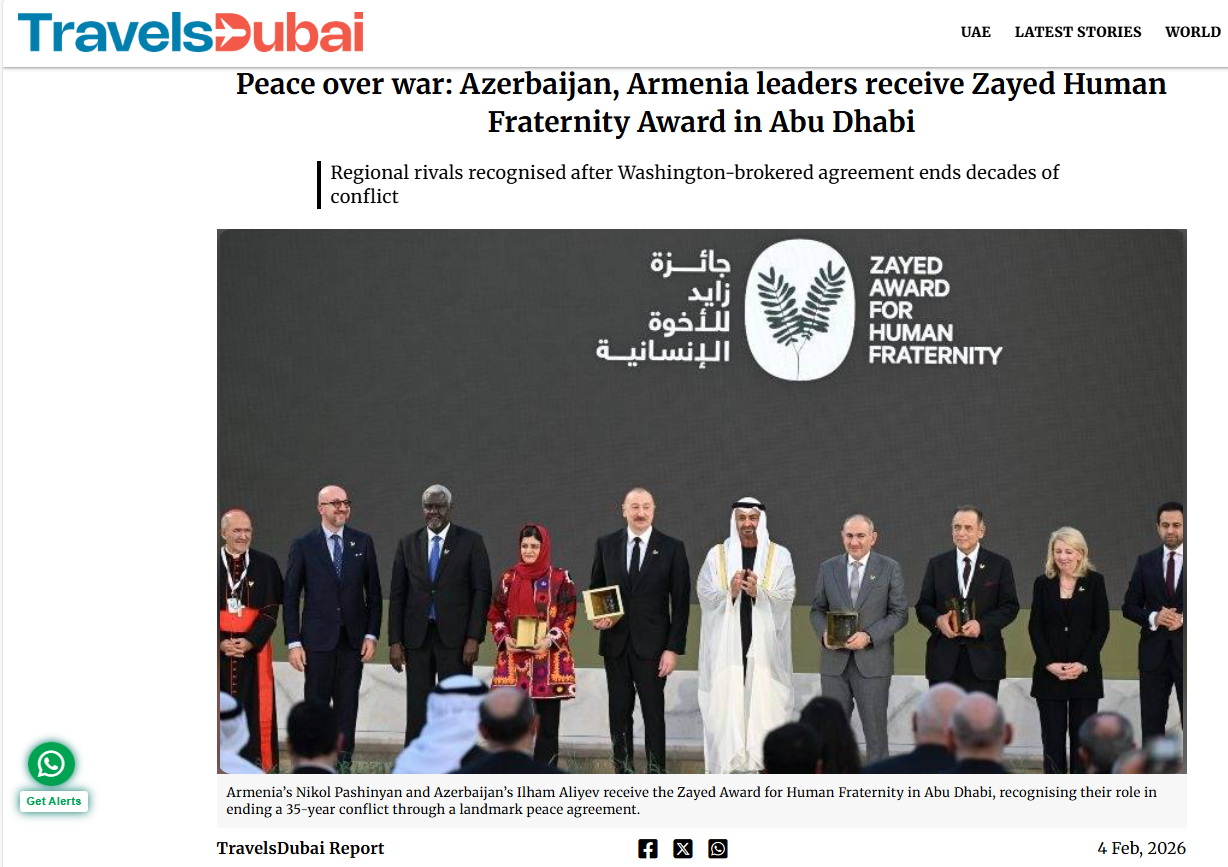 Həmçinin bildirilib ki, Azərbaycan Prezidenti İlham Əliyev və Ermənistanın Baş naziri Nikol Paşinyan fevralın 4-də Birləşmiş Ərəb Əmirliklərinin paytaxtı Əbu-Dabidə 2026-cı il “Zayed İnsan Qardaşlığı Mükafatı”nın təqdimolunma mərasimində iştirak ediblər. Mükafat bu il hər iki liderə təqdim olunub.