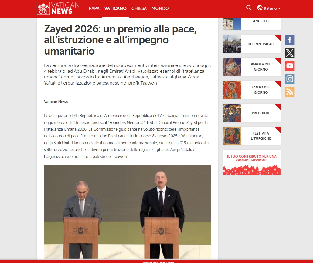 Vatikanın rəsmi “Vatican News” nəşri də Prezident İlham Əliyevə “Zayed İnsan Qardaşlığı Mükafatı”nın təqdim olunması, həmçinin dövlətimizin başçısının Ermənistanın Baş naziri ilə keçirdiyi görüş barədə material dərc edib.