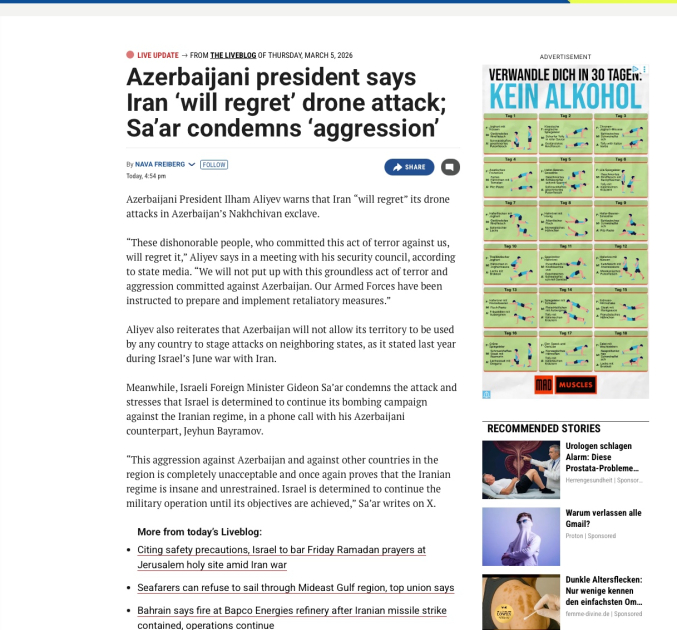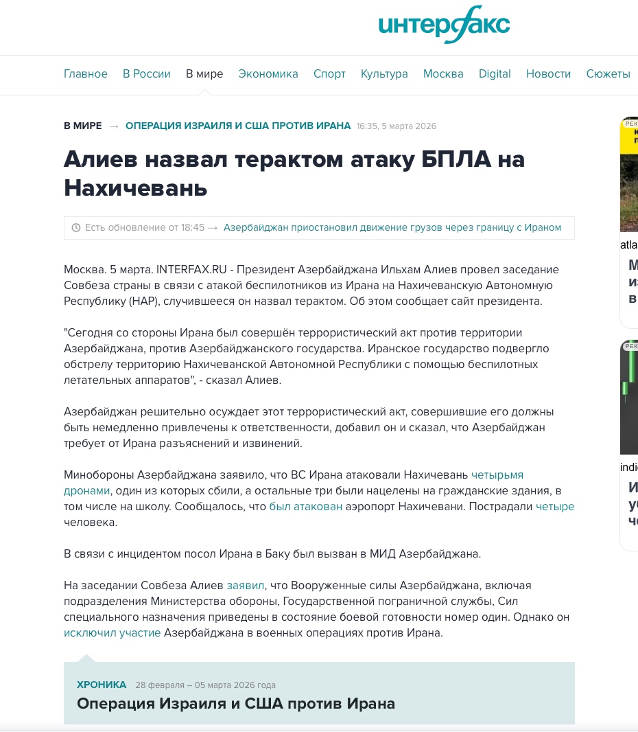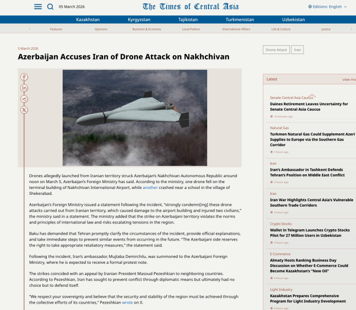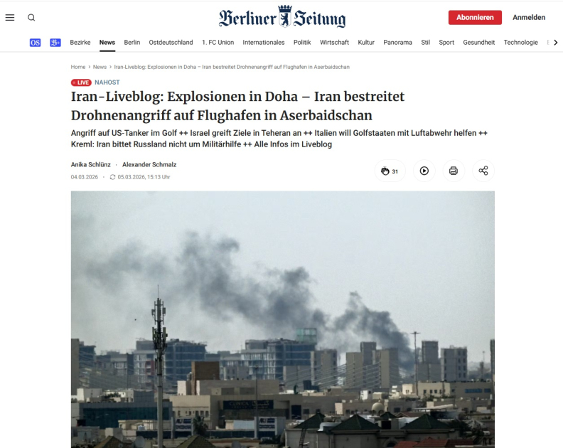 “Tagesspiegel” qəzeti İran müharibəsinin getdikcə daha çox ölkəyə yayıldığını qeyd edərək, PUA-ların Azərbaycanın Naxçıvan Muxtar Respublikasının ərazisində hava limanı yaxınlığında və bir məktəbin yaxınlığında düşdüyünü yazıb. Azərbaycanın bu iyrənc terror aktına görə cavab tədbirləri görəcəyini açıqladığı, Prezident İlham Əliyevin göstərişi ilə Silahlı Qüvvələrin döyüş hazırlığı vəziyyətinə gətirildiyi qeyd olunub.