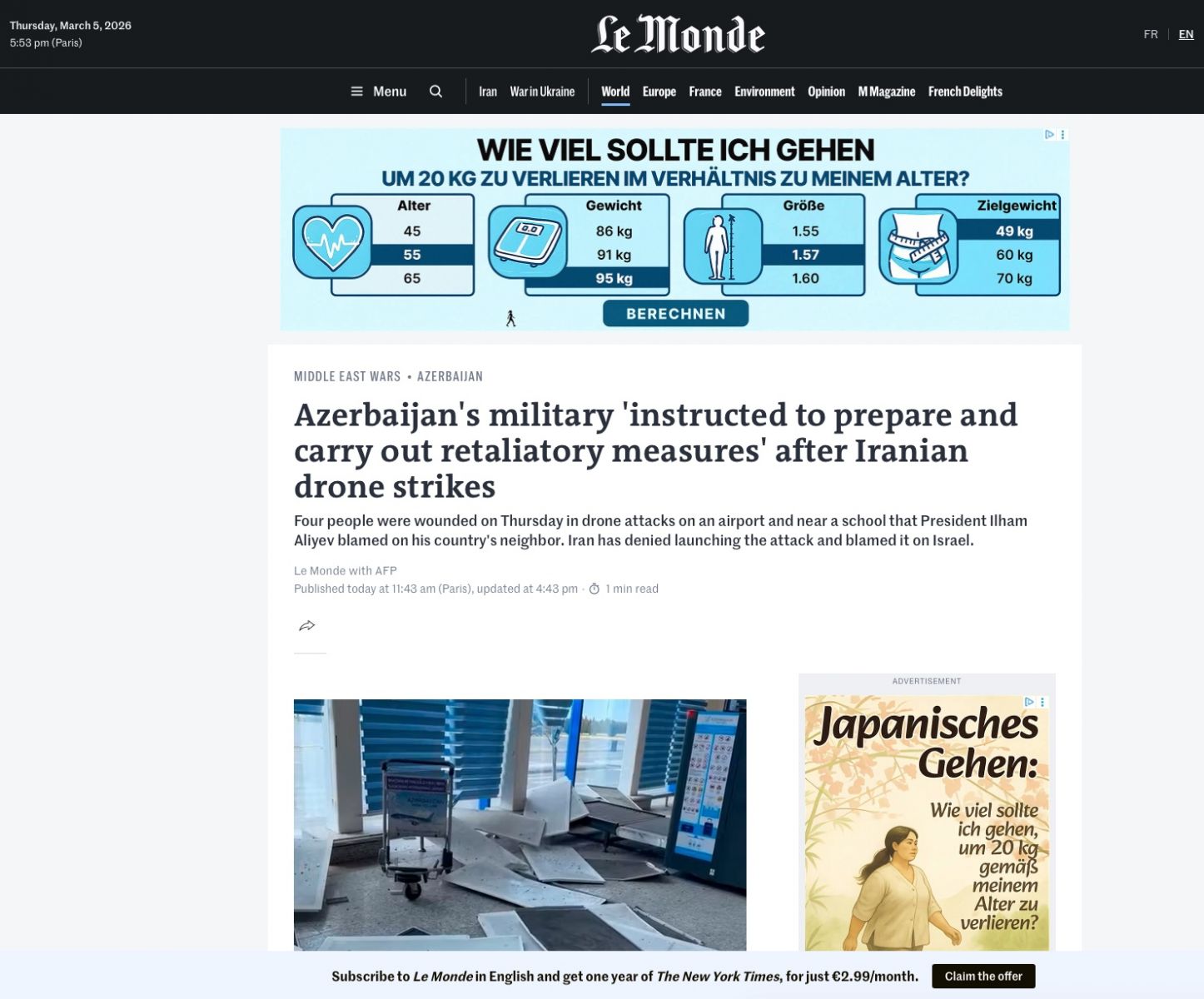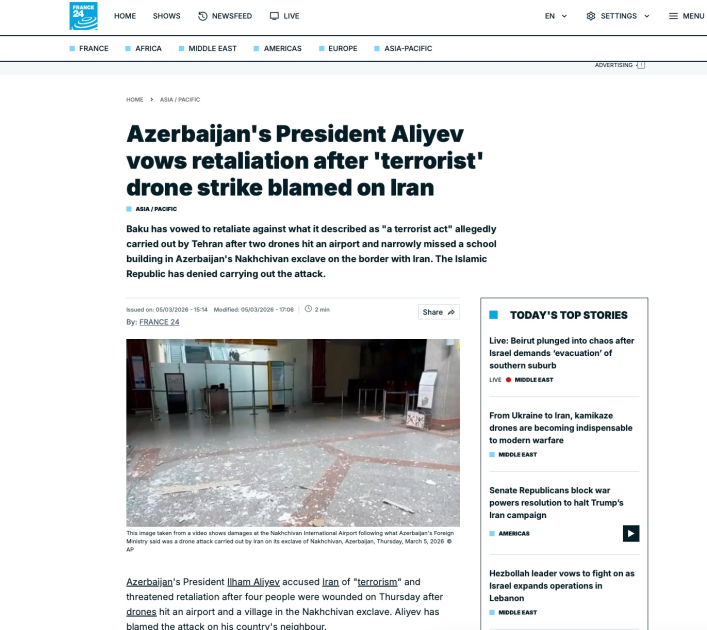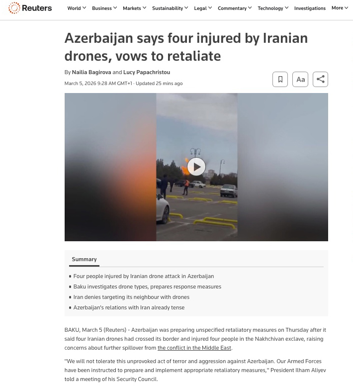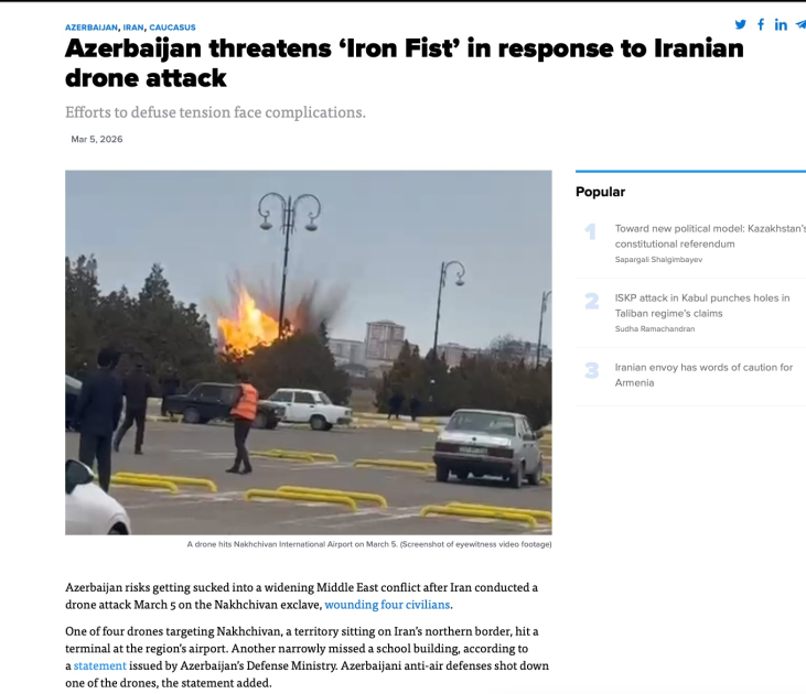 Nəşr qeyd edir ki, pilotsuz uçuş aparatlarından biri Azərbaycan ərazisində yerləşən obyektlərdən birinə düşüb və hadisə nəticəsində bir neçə nəfər yaralanıb. Məqalədə Prezident İlham Əliyevin bu hadisənin ciddi təhlükəsizlik insidenti olduğunu bildirdiyi və İranın məsuliyyət daşımalı olduğunu vurğuladığı qeyd edilir.