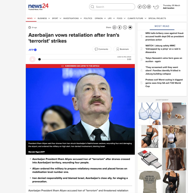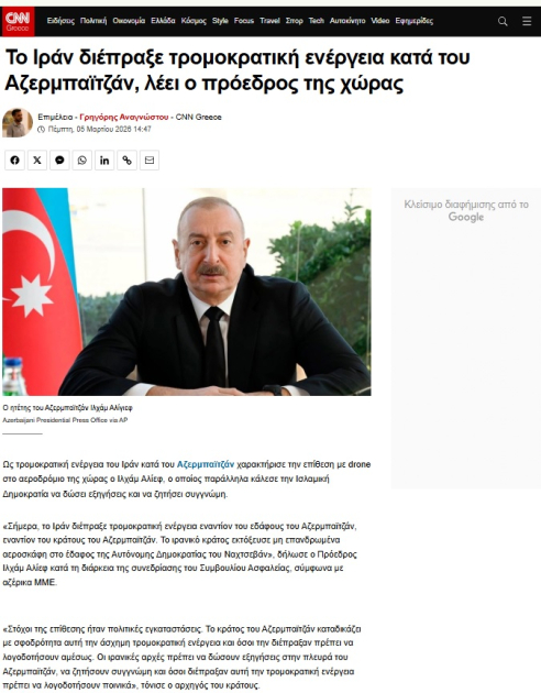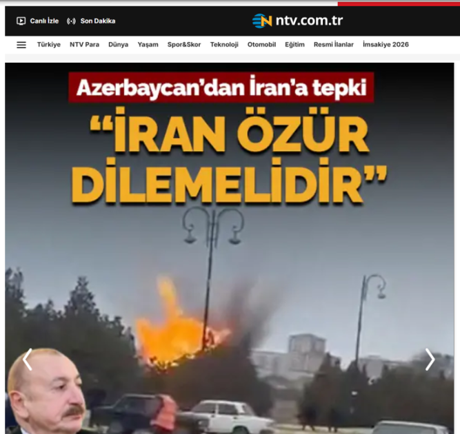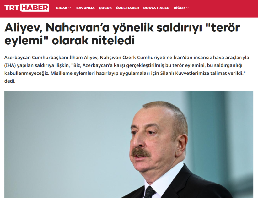 Yunanıstanın dövlət televiziya və xəbər platforması “ERT News” yazır ki, Prezident İlham Əliyev Azərbaycanın ərazisinə edilən dron hücumunu İran tərəfindən həyata keçirilmiş terror aktı kimi qiymətləndirib.
