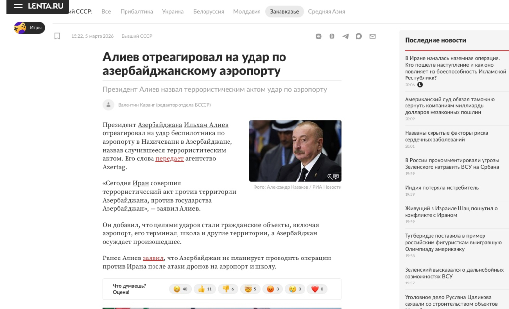 Rusiyanın “RBC”, “Vedomosti”, “RIA Novosti”, “Interfax”, “Komsomolskaya Pravda”, “Lenta.ru”, “Meduza”, “Rossijskaya qazeta” və digər informasiya resursları da Prezident İlham Əliyevin bəyanatına geniş yer ayıraraq onun İranın hücumunu terror aktı kimi qiymətləndirdiyini və Azərbaycan Ordusunun yüksək hazırlıq vəziyyətinə gətirildiyini qeyd ediblər.