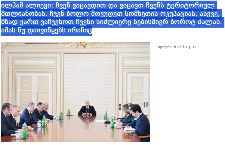 “interpressnews.ge”, “imedinews.ge”, “bpn.ge”, “1tv.ge”, “radiotavisupleba.ge”, “qafqazturk.com”, “aktual.ge”, “interpress.ge”, “24news.ge”, “rustavi2.ge”, “palitranews.ge” informasiya portalları, radio və televiziyaları Prezident İlham Əliyevin İran tərəfindən Naxçıvan Muxtar Respublikasının ərazisinə dron hücumlarını qətiyyətlə pislədiyini bildirir.
