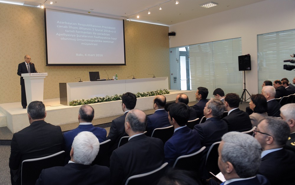 Martın 4-də Bakıda Azərbaycan Prezidentinin “Azərbaycan Respublikasının mərkəzi və yerli icra hakimiyyəti orqanlarında Apellyasiya Şuralarının yaradılması haqqında” 2016-cı il 3 fevral tarixli Fərmanına uyğun olaraq yaradılmış Apellyasiya Şuralarının fəaliyyətinə həsr edilən ümumrespublika seminar-müşavirəsi keçirilib.
