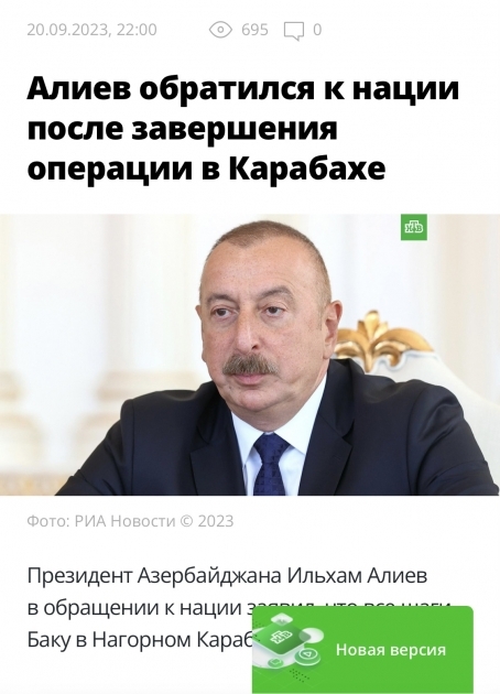 “NTV” telekanalı Azərbaycan Prezidentinin Qarabağda aparılan tədbirlərin tamamilə legitim, qanuni və ədalətli olması barədə fikirlərini sitat gətirir. Materialda qeyd olunub ki, qanunsuz silahlı birləşmələr tam tərksilah olunacaq, onlardan müsadirə olunan texnika məhv ediləcək.
