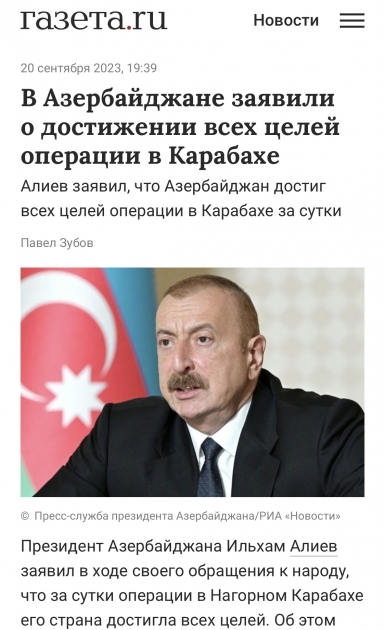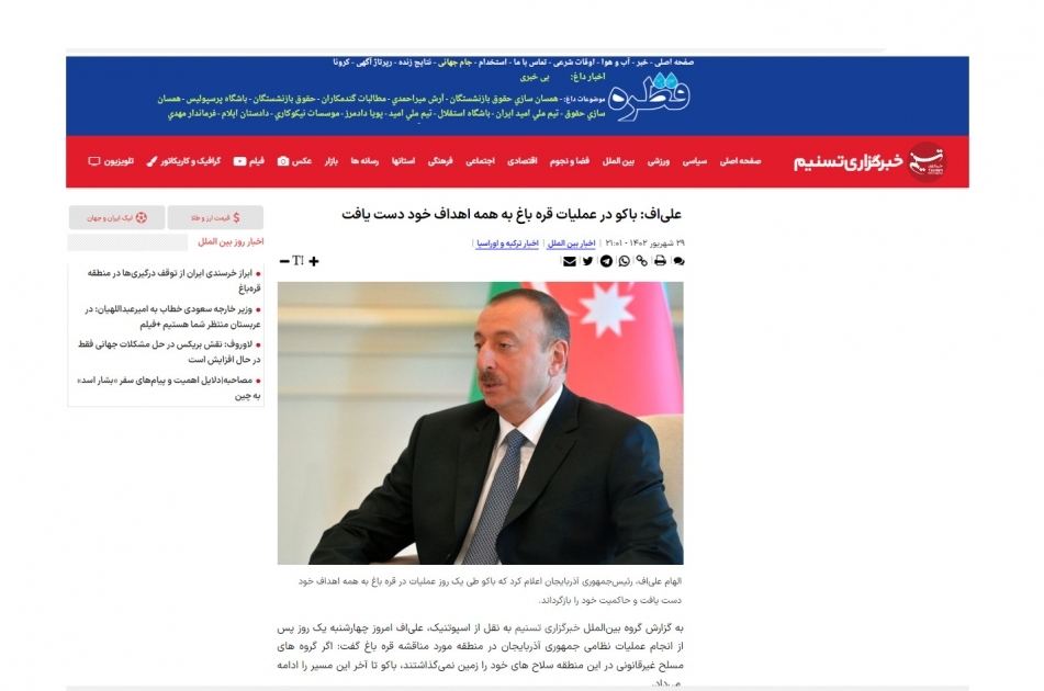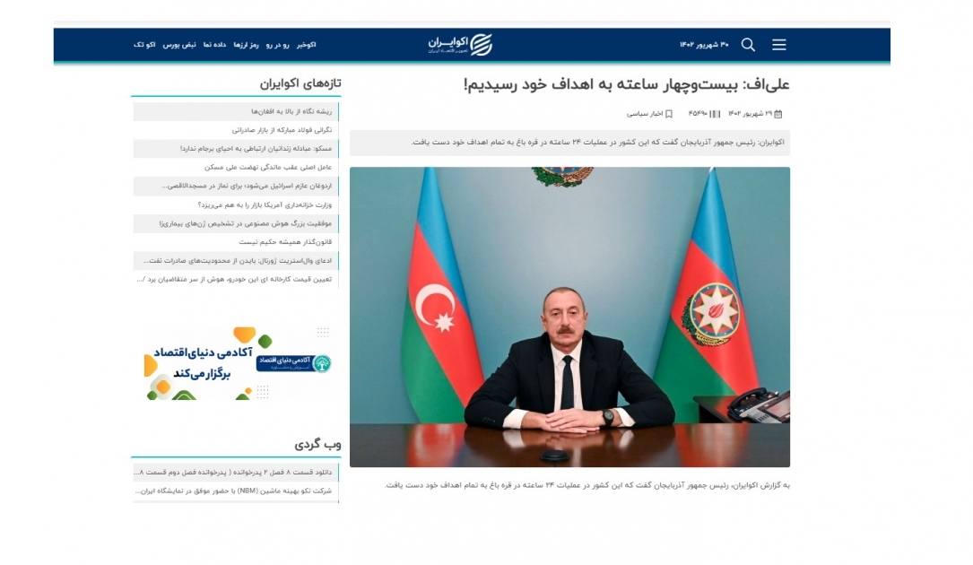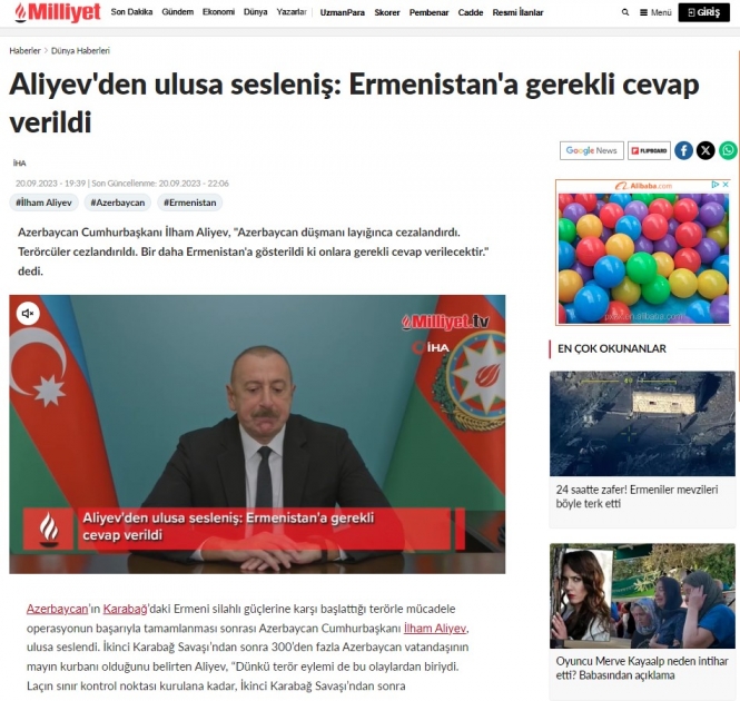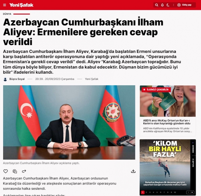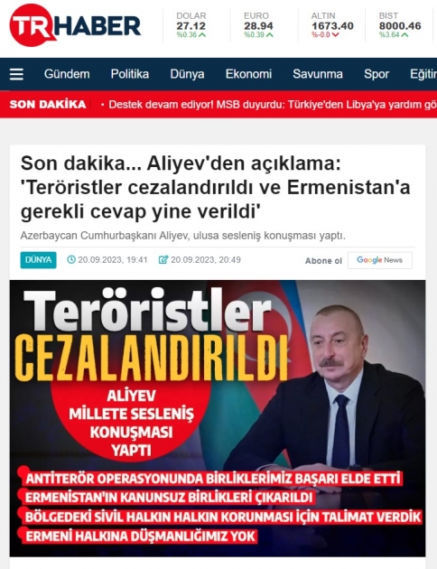 Materiallarda Azərbaycan Prezidenti İlham Əliyevin xalqa müraciətindən sitat gətirilib. Qeyd olunub ki, Azərbaycan öz məqsədinə nail olaraq suverenliyini bərpa etdi. Prezident İlham Əliyev orduya antiterror tədbirləri zamanı mülki əhalinin təhlükəsizliyinin təmin olunması haqqında əmr verib. Xəbərlərdə nəzərə çatdırılıb ki, Prezident Qarabağın erməni əhalisinin təhlükəsizliyinə və hüquqlarının qorunmasına zəmanət verib.