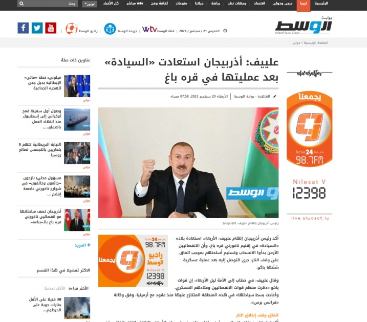 “Əl-Vəsat” nəşrində dərc olunan “Azərbaycan Qarabağda öz suverenliyini bərpa edib” sərlövhəli yazıda da Prezident İlham Əliyevin xalqa müraciətindən sitatlar verilib. Qeyd olunub ki, Azərbaycan Prezidenti İlham Əliyev uğurlu antiterror tədbirləri nəticəsində qanunsuz erməni silahlı birləşmələrinin mövqelərdən çıxarılma prosesinin başladığını, o cümlədən onların Azərbaycanın şərtini qəbul edərək silahları təhvil verdiyini bildirib. Ərəbdilli oxucuların diqqətinə çatdırılıb ki, Bakının antiterror tədbirlərinə başlaması qanunsuz erməni hərbi birləşmələrinin təxribatları, o cümlədən azərbaycanlı hərbçilər və mülki şəxslərin həlak olması ilə nəticələnən mina terroru ilə bağlı olub.