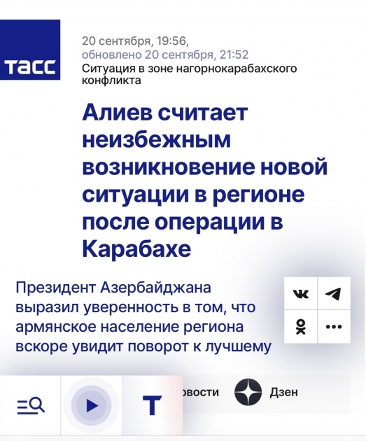 TASS agentliyinin materiallarında Prezident İlham Əliyevin xalqa müraciətində antiterror tədbirlərindən sonra regionda vəziyyətin dəyişəcəyi, kriminal rejimin süqutundan sonra gərginlik mənbəyinin keçmişdə qaldığı barədə fikirləri yer alıb. Agentlik dövlət başçısının Azərbaycan Ordusunun qarşıya qoyulan vəzifəni peşəkarlıqla yerinə yetirməsi, qəhrəmanlıq və şücaət göstərməsi barədə dediklərini diqqətə çatdırıb. Eyni zamanda, Prezident İlham Əliyevin hərbçilərə dinc əhalinin zərbə altına düşməməsi və qorunmasına dair tapşırıq verməsi önə çəkilib.