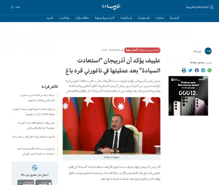 “Arab.48” informasiya portalında dərc olunmuş materialda da Azərbaycanın qısamüddətli antiterror tədbirlərindən sonra öz ərazilərində suveren hüquqlarını bərpa etdiyi, qanunsuz erməni hərbi birləşmələrinin ağ bayraq qaldıraraq təslim olduğu və Xankəndindəki separatçı rejimin Bakının bütün şərtlərini qəbul etdiyi bildirilib. Məqalədə, eyni zamanda, Prezident İlham Əliyevin Qarabağdakı erməniəsilli vətəndaşların Azərbaycan Konstitusiyasına müvafiq şəkildə reinteqrasiyası barədə fikirləri yer alıb. Yazıda qeyd olunub ki, Azərbaycanın dövlət başçısı Qarabağ ermənilərinin bütün hüquqlarının təmin ediləcəyini də söyləyib.
